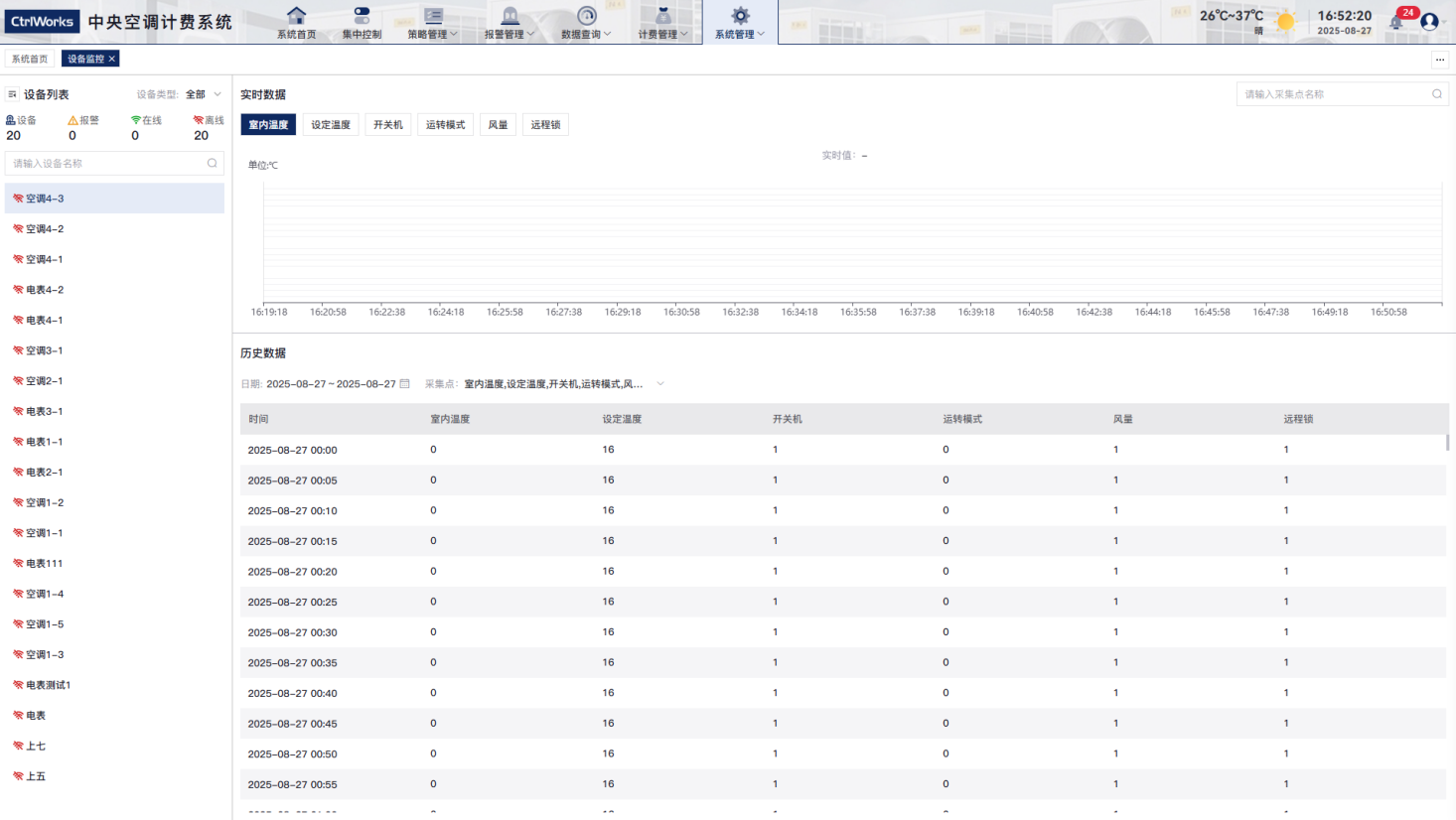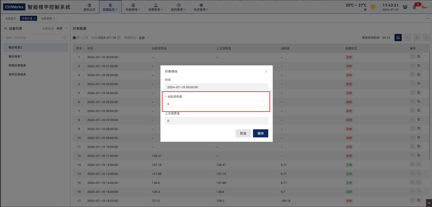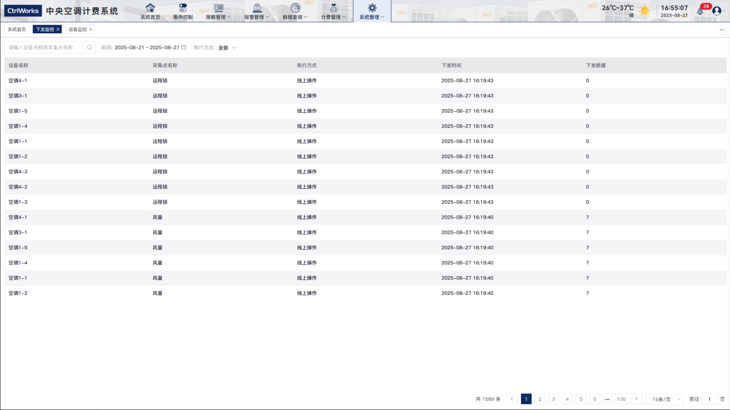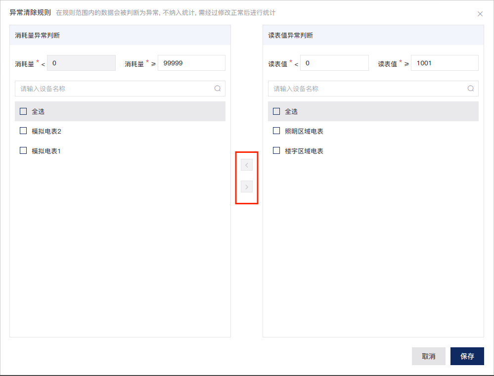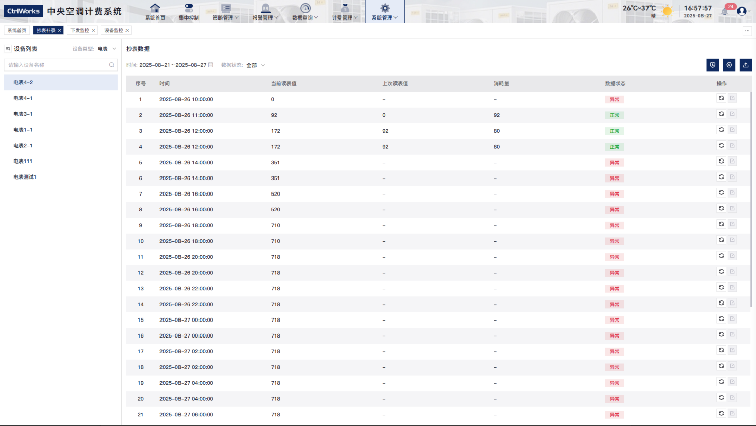 ## 设备监控  设备列表:点击【设备类型】的下拉,筛选电表和空调设备。查看当前设备统计的总数、报警数、在线数以及离线数量。在搜索框内输入设备名称的关键字可进行模糊搜索,返回的设备信息前方图标代表当前设备的在线、离线、报警情况(需配置报警规则才会提示)。 实时数据:点击【采集点名称】进行切换,在输入框中输入采集点名称模糊搜索,查询当前设备下的采集点实时数据,实时数据展示近100条。 历史数据:点击【日期】自定义筛选近1个月的缓存数据。点击【采集点】下拉进行采集点筛选,支持单选或多选,在输入框中输入采集点名称进行模糊搜索。查询到的采集点数据间隔周期为5分钟。 ## 下发监控  在【输入框】中输入设备名称或采集点名称进行模糊搜索。点击【时间】自定义筛选。点击【执行方式】下拉筛选全部、线上操作(系统下发操作)、定时任务(定时任务下发操作)、联动触发(报警联动触发操作)、锁定控制(监听锁定功能,非锁定设定状态下发复位上一状态操作)、线下操作(面板控制操作)。 ## 抄表补录  设备列表:在搜索框内输入电表设备名称进行模糊搜索。 抄表数据:点击【时间】自定义按天筛选。点击【数据状态】下拉筛选全部、正常、异常。 激活码:点击激活密码,弹出激活密码,输入当前用户密码,激活后10分钟内可执行修改保存操作,超过10分钟后如若需要进行修改则需重新激活。  异常清除规则:点击规则设置,弹出异常清除规则设置弹窗,规则主要针对两大内容进行设定:  消耗量异常判断:系统初始化为消耗量<0(禁止修改),消耗量初始化≥99999(可修改),超过这个规则范围的则不纳入统计将判断数据异常。读表值异常判断:系统初始化为读表值<0(可修改),读表值≥1001(可修改),超过这个规则范围的则不纳入统计将判断数据异常。在输入框中输入设备名称进行模糊搜索。系统初始化设备以消耗量异常判断规则执行,若有设备需要按照读表值异常判断规则执行,则需将消耗量异常判断设备移入到读表值异常判断中,设备支持单选和多选。 导出:点击导出按钮,可将当前设备的抄表数据导出excel。 同步:点击同步按钮,将上一个时间段的“当前读表值”同步到本时间段的“上次读表值”中,假设上一次值为空,则会提示“不存在上次读表值”。 修改:未激活状态下修改图标为灰色禁用状态,需激活后才可进行操作。激活状态下,禁止新增、设置、导出。数据状态为正常状态时,禁止修改操作,只有异常状态下才可支持修改,修改完必须点击保存,提交后数据会重新统计,需等待片刻,为保障数据修复的完整性,等待期间禁止一切操作(若修复的数据量过大等待时间会过长)。 抄表修改弹窗:仅修改当前读表值数值,修改后需点击保存方可完成。