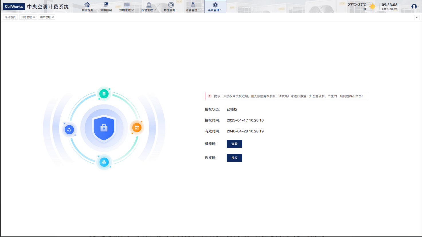 系统部署第一时间进行系统激活才可进行其它功能模块操作。点击【机器码】查看按钮,复制机器码寻找技术团队提供授权码,点击【授权码】的授权按钮粘贴授权码,完成系统激活。系统激活存在永久或三个月使用期。使用期过后需重复激活操作或进行永久激活。
