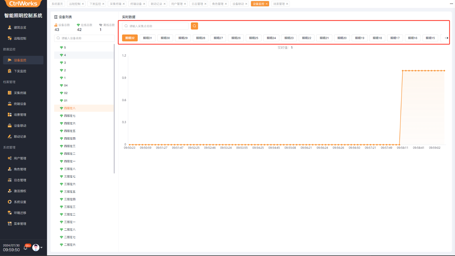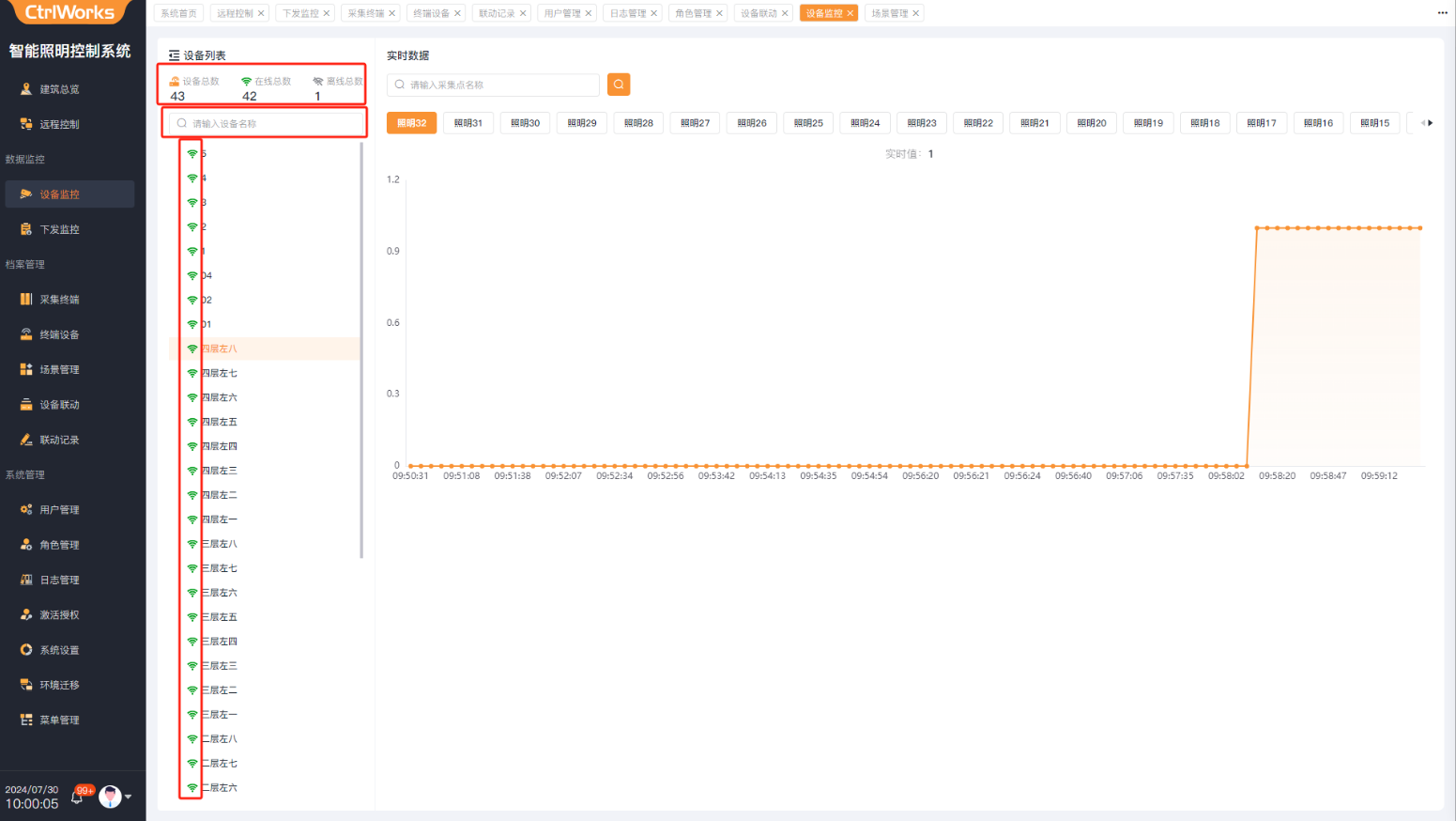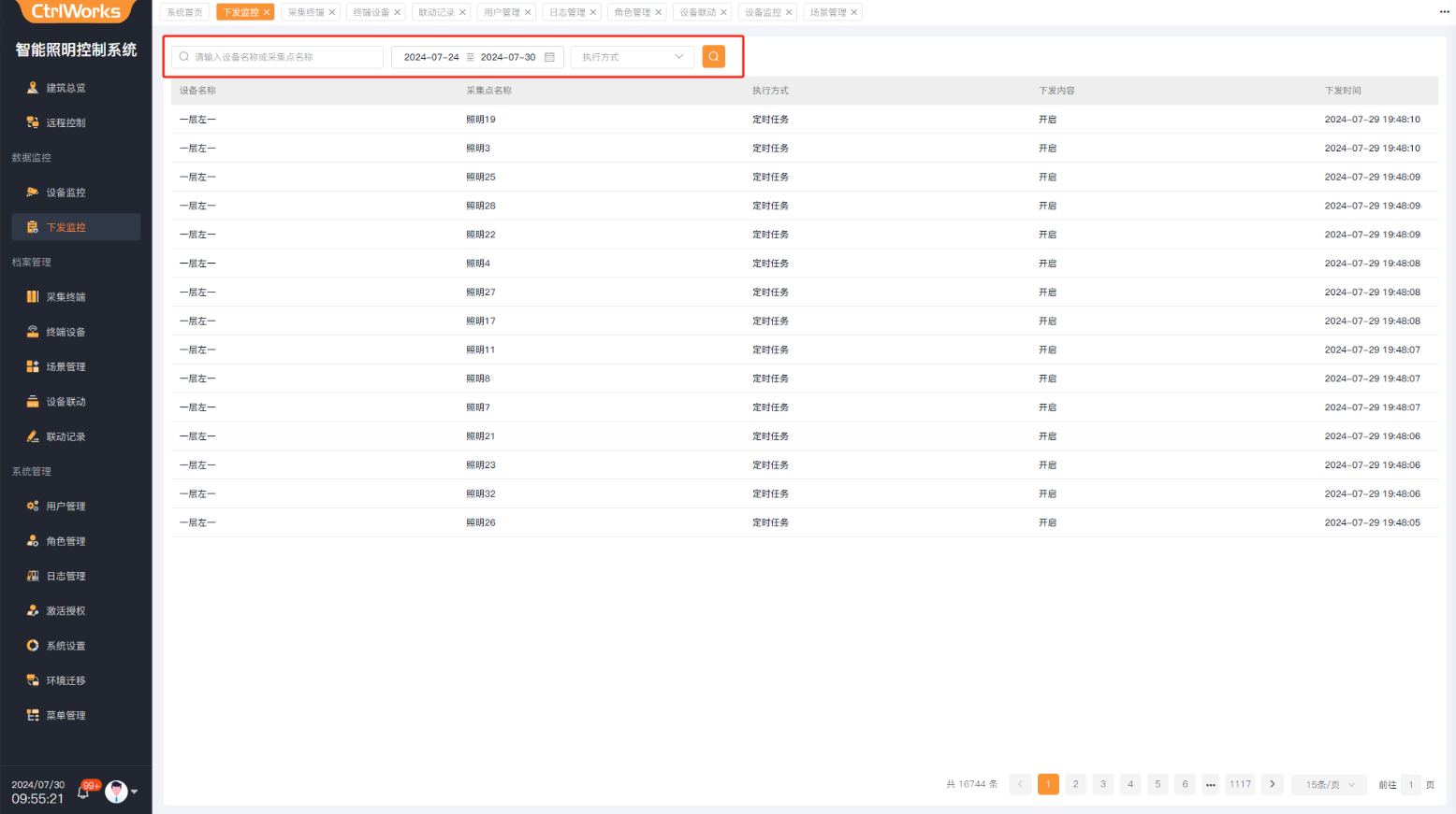 ## 设备监控 ### 设备列表  在【搜索框】填入设备名称进行模糊搜索。查看当前设备统计的总数、在线数以及离线数量。返回的设备信息前方图标代表当前设备的在线、离线情况。 ### 实时数据  点击【采集点名称】进行切换。在【输入框】中输入采集点名称模糊搜索,查询当前设备下的采集点实时数据,实时数据展示共100条。 ## 下发监控  在【输入框】中输入设备名称或采集点名称模糊搜索,点击【日期】自定义筛选缓存数据,点击【执行方式】下拉选择人员操作、定时任务、联动触发。