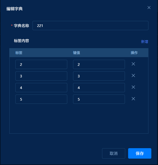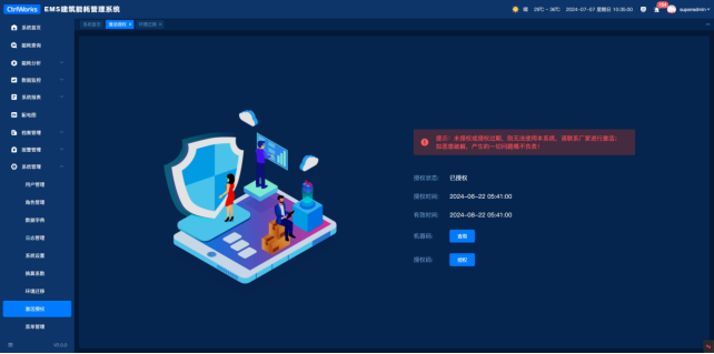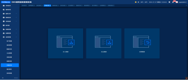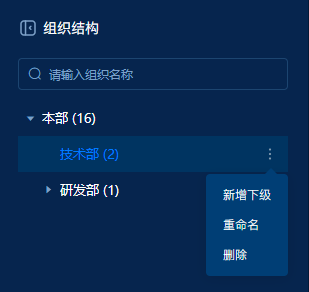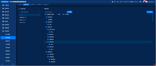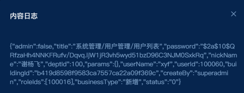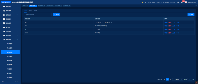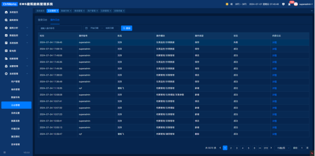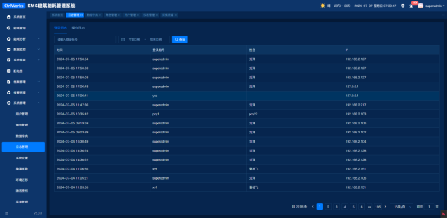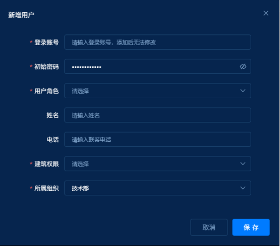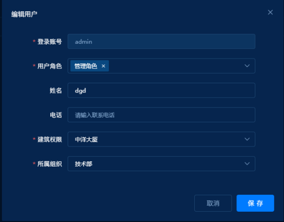 # 用户管理 登录后可以通过用户管理功能来新增、编辑、删除、禁用用户,用于维护系统中的用户信息。  (1)组织结构-查询:查询条件为组织结构,输入组织名称点击回车即可。  (2)组织结构-添加下级:点击,弹出添加下级页面   ①组织名称:必填项,维护组织名称。 ②取消:关闭页面。 ③保存:保存已维护的组织名称。 (3)组织结构-重命名:点击,弹出重命名页面,可修改组织名称(注:功能操作参考添加下级)  (4)组织结构-删除:点击,弹出提示语“是否执行删除操作”(注:1.当组织下存在用户不允许删除2.当组织下存在下级不允许删除) ①取消:关闭提示语弹窗,不执行删除操作 ②确定:关闭提示语弹窗,执行删除操作  (5)用户列表-查询:查询条件为登录账号,查询时输入账号点击查询即可。  (6)用户列表-新增:点击,弹出新增用户页面  ①登录账号:必填项,维护用户的登录账号。 ②初始密码:必填项,维护账号的登录密码,默认为Stnh@24yb!,.。 ③用户角色:必填项,下拉框,取角色管理中维护的角色,可多选。 ④姓名:非必填,维护用户的姓名。 ⑤联系电话:非必填,维护用户的联系号码。 ⑥建筑权限:取建筑管理维护的建筑层级。 ⑦所属组织:必填项,取组织结构中维护的组织,根据所需选择。 ⑧取消:关闭页面。 ⑨保存:保存已维护的账号信息。 (7)用户列表-编辑:点击,弹出编辑用户页面,可对已维护的用户信息进行修改(注:1.功能操作参考添加2.登录账号不可修改)  (8)用户列表-删除:点击,弹出提示语“是否执行删除操作” ①取消:关闭提示语弹窗,不执行删除操作。 ②确定:关闭提示语弹窗,执行删除操作。  (9)用户列表-批量删除:点击,弹出提示语“是否执行删除操作”(注:当未勾选用户时按钮置灰,不允许操作,当勾选用户时,允许操作) ①取消:关闭提示语弹窗,不执行删除操作。 ②确定:关闭提示语弹窗,执行删除操作。  (⑩)用户列表-重置密码:点击,弹出重置密码页面(注:当未勾选用户时按钮置灰,不允许操作,当勾选用户时,允许操作)  ①新密码:必填项,维护账号的新密码。 ②确认密码:必填项,应与新密码中一致。 ③取消:关闭页面。 ④保存:保存已维护的密码。 # 角色管理 角色管理用于维护系统中的角色,通过角色维护系统中的功能权限,有权限时可正常操作模块,无权限时则不可以操作模块。  (1)角色列表-查询:查询条件为角色名称,输入名称点击回车即可。  (2)角色列表-添加:点击,弹出新增角色页面  ①角色名称:必填项,维护角色的名称。 ②角色描述:非必填,描述角色。 ③取消:关闭页面。 ④保存:保存已维护的角色信息。 (3)角色列表-编辑:点击,弹出编辑角色页面,可对已维护的角色进行修改。  (4)角色列表-删除:点击,弹出提示语“是否执行删除操作” ①取消:关闭提示语弹窗,不执行删除操作 ②确定:关闭提示语弹窗,执行删除操作  (5)功能权限-查询:查询条件为权限名称,输入名称点击查询即可。  (6)保存:点击,可保存已维护的功能权限。 # 数据字典 数据字典用于维护系统中数据项、数据结构、处理逻辑等进行定义和描述。  (1)数值、开关、状态:固定选项,可切换不同页签,用于维护该页签下字典数据 (2)查询:查询条件输入字典名称点击查询。  (3)添加:点击,弹出新增页面 ①字典名称:维护字典的名称。 ②新增:可新增标签、键值。 ③取消:关闭新增页面。 ④保存:保存已维护的字典信息且关闭页面。  (4)编辑:点击,弹出编辑页面,可对已维护的字典信息进行修改(注:功能操作可参考新增)  (5)删除:点击,弹出提示语“是否删除该条数据” ①取消:关闭提示语页面,不删除该条数据 ②删除:关闭提示语页面,且删除该条数据  (6)上移:点击上移,往上移动一行。 (7)下移:点击下移,往下移动一行。 # 日志管理 ## 登录日志 登录日志用于记录用户的登录操作,可查看用户的登录时间、IP等。  (1)查询:查询条件分为登录账号、时间段,查询时选择对应的查询条件,例如查询2024年1月6日的数据,开始时间和结束时间选择1月6日点击查询即可。  ## 操作日志 操作日志用于记录用户在系统中所做的新增、编辑、删除类的操作,可查看用户具体的操作内容。  (1)查询:查询条件分为登录账号、时间段,查询时选择对应的查询条件,例如查询2024年1月6日的数据,开始时间和结束时间选择1月6日点击查询即可。  (2)详情:点击,弹出内容日志页面,可查看操作的内容日志。  # 系统设置 系统LOGO用于维护系统的LOGO样式,可自定义选择。  (1)登录页LOGO:用于维护登录页的LOGO,默认为,可点击按钮更换或还原(注:建议选择至少 208*34 分辨率图片作为登录页LOGO) ①更换:可从电脑中选择图片进行更换 ②还原:恢复至默认LOGO ③是否启用:点击,可编辑状态,启用为,禁用为 启用:当为启用状态时,登录页显示LOGO 禁用:当为禁用状态时,登录页不显示LOGO  (2)登录页背景:用于维护登录页的背景图,可点击按钮更换或还原(注:建议选择至少 1920*1080 分辨率图片或者视频作为登录页背景,限3M以内) ①更换:可从电脑中选择图片或视频进行更换 ②还原:恢复至默认背景图  (3)登录页标题:用于维护系统登录页标题,默认为,可点击按钮更换或还原(注:建议文字数量不超过15个) ①更换:可从电脑中选择图片进行更换 ②还原:恢复至默认标题  (4)页签LOGO:用于维护系统页签的LOGO,默认为,可点击按钮更换或还原(注:建议选择至少 16*16 分辨率图片作为