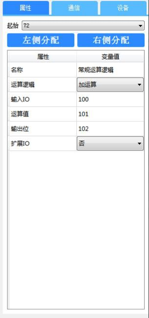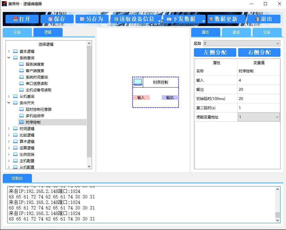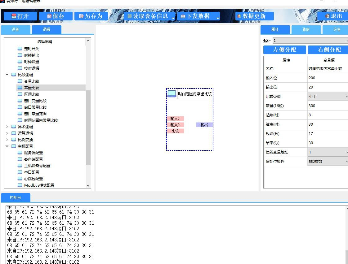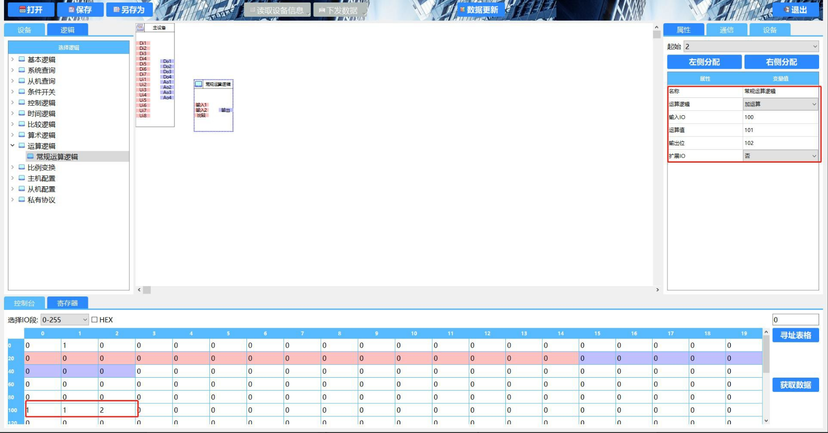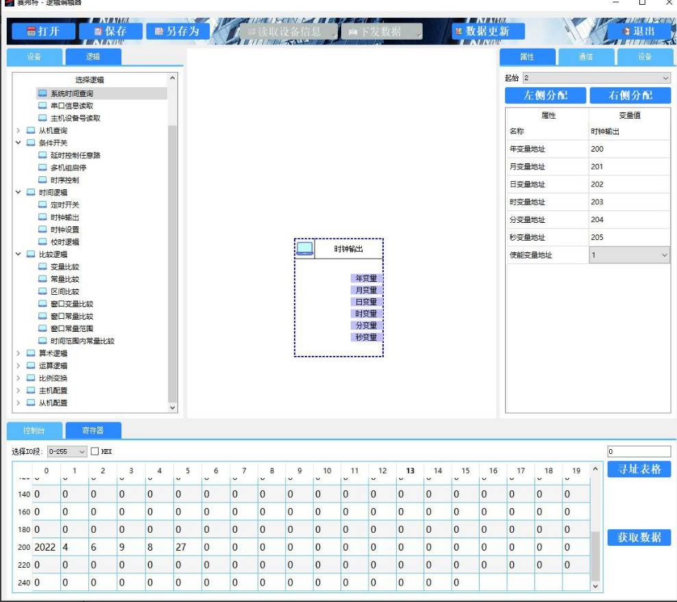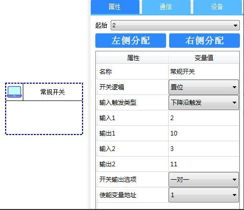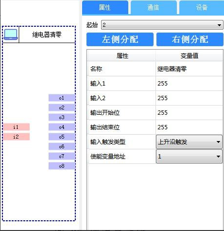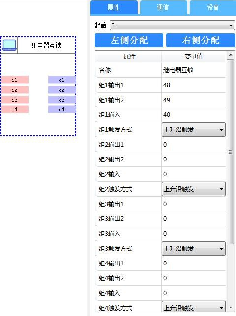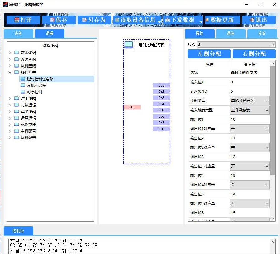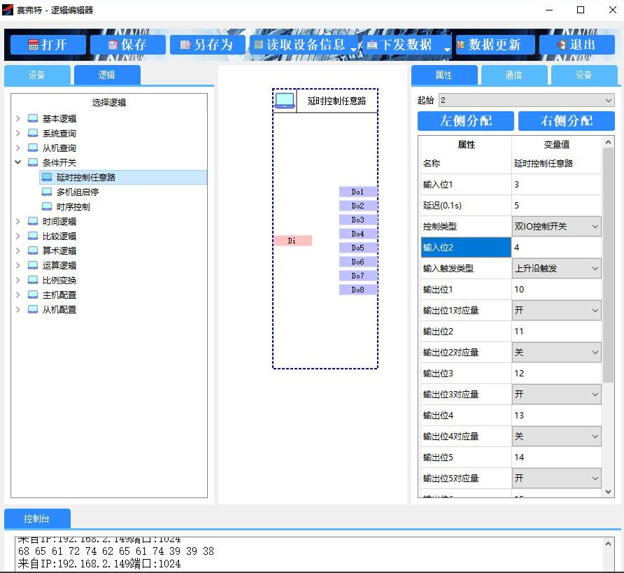 ## 8.1.基本逻辑 ### 8.1.1.常规开关 如图 32 所示  图 32 常规开关设置 ①开关逻辑:该选项主要指DO 的输出类型,脉冲模式表示控制 DO 输出脉冲,置位模式表示控制DO 输出为 1,清零模式表示控制DO输出为 0,取反模式控制 DO 输出为 0/1,取反模式下互锁逻辑才有用。 例:如果两个 DI 变量地址分别为 02 和 03,需要执行 DI2 上升沿和 DI3 上升沿,分别控制DO 变量 10 和 11 输出置位,那么可以进行如下图 33 设置:  图 33 触发类型选择 ②输入触发类型: 上升沿触发 输入正脉冲的时候有效,比如轻触按键按下 下降沿触发 输入负脉冲的时候有效,比如轻触按键释放 长按触发 输入一直保持1的时候才有效,比如轻触按键一直处于按下的状态 双击触发 一般用于按键双击时有效,可以用做清零 短按触发 输入短时间为1的时候才有效 脉冲触发 输入正脉冲/负脉冲的时候有效 ③开关输出选项: 一对一 该选项主要应用于单路/双路 DI 控制 DO 输出,如果用到输入 1 输出 1,那么输入 2 和输出 2 设为 255(无效),如果用到输入 2 输出 2,那么输入 1 和输出 1 设为 255(无效)。 如果要用双路DI 分别控制双路DO 输出,那么输入 1 输出 1,输入 2 输出 2 填入相应的DI 和DO 变量地址即可 用于一条回路输入控制输出或者两条回路输入控制输出 一对任意 该选项主要应用于单路DI 控制两路DO 输出,当输入 1 或输入 2有效时,输出 1 和输出 2 同时触发 一对区间 该选项主要应用于单路DI 控制多路DO 输出,当输入 1 或输入 2有效时,输出变量 1 到输出变量 2 区间所有DO 都触发 互锁输出 该选项主要应用于单路DI 控制两路DO 互锁输出,当输入 1 或输入 2 有效时,输出变量 1 输出 1,输出变量 2 输出 0 联锁输出 该选项主要应用于单路DI 控制两路DO 联锁输出 算是包含关系 ④使能变量地址 当使能变量的值为 1 时才可进行该逻辑操作 ### 8.1.2.继电器互锁 由单路DI 或者多路DI 控制多组DO 互锁输出; 互锁解释:假设 有A、B 两台机组,当机组A 运行时,B 停止运行;B 机组运行时,A停止运行。 场景说明:多回路场景中,利用某一回路的通断去控制其他回路的通断,如图 34 所示;  图 34 继电器互锁 ### 8.1.3.继电器清零 由单路DI 或者双路DI 控制多组DO 输出清零; 由高电位“代表逻辑 1”变为低电位“代表逻辑 0”,如图 35 所示;  图 35 继电器清零 ## 8.2.系统查询 ### 8.2.1.服务端搜索 拖出“服务端搜索”控件,点击“下发数据”按钮,选择“系统查询”进行下发,控制台会显示读取的设备服务器 IP 和端口号信息,如图 36 所示;  图 36 服务端搜索 ### 8.2.2.客户端搜索  图 37 系统时间查询 ### 8.2.3.系统时间查询 如需要查询设备当前时间是否需要校准,可拖出“系统时间查询”控件,点击“下发数据”按钮,选择“系统查询”进行下发,控制台会显示读取的系统时间信息,如图 38 所示;  图 38 系统时间查询 ### 8.2.4.串口信息读取 如需要查询设备串口波特率,可拖出“串口信息读取”控件,属性栏可选择哪一路串口,点击“下发数据”按钮,选择“系统查询”进行下发,控制台会显示读取的串口信息,如图 39 所示;  图 39 串口信息读取 ### 8.2.5.主机设备号读取 如需要查询主机设备号,可拖出“主机设备号读取”控件,点击 “下发数据”按钮,选择“系统查询”进行下发,控制台会显示读取的设备号信息,如图 40 所示;  图 40 主机设备号读取 ### 8.2.6.Modbus 模式读取 如需要查询Modbus 模式,可拖出“Modbus 模式读取”控件,点击“下发数据”按钮,选择“系统查询”进行下发,控制台会显示读取的Modbus 模式信息,如图 41 所示;  图 41 TCP 模式读取 ### 8.2.7.硬件信息读取 如需要查询硬件信息,可拖出“硬件信息读取”控件,点击“下发数据”按钮,选择“系统查询”进行下发,控制台会显示读取的硬件信息;如图 42 所示;  图 42 硬件信息读取 ### 8.2.8.设备版本信息读取 如需要查询设备版本信息,可拖出“设备版本信息读取”控件,点击“下发数据”按钮,选择“系统查询”进行下发,控制台会显示读取的设备版本信息,如图 43 所示;  图 43 设备版本信息 ## 8.3.条件开关 ### 8.3.1.延时控制任意路 该场景 1 个逻辑最多可控制 8 路DO 延时输出,可控制任意几路 DO 输出高/低电平。超过 8 路可以用多个延时逻辑组合,延时时间可设。 控制类型为“单IO 控制开关”时,由输入位 1 DI 控制DO 开关,例如下图设置按键 03 上升沿控制输出偶数变量 10,12,14,16 对应的 DO 口全开/全关,按一次是依次打开,再按一次依次关闭,间隔时间 0.5s,如图 44 所示;  图 44 单IO 控制属性配置 控制类型为“双IO 控制开关”时,由输入位 1 DI 控制 DO 开,由输入位 2 DI 控制 DO 关,例如图设置按键 03 上升沿控制输出奇数变量 11,13,15,17 对应的DO 口全开/全关,按一次是依次打开,再按一次依次关闭,间隔时间 0.5s,如图 45 所示;  图 45 双IO 控制属性配置 ### 8.3.2.多机组启停 该场景主要针对通过某个输入点的触发两个 DO 点间隔一定时间来回开关操作。例如: 用按键输入变量 5 控制两路继电器DO 点 35 和 36 启停,先 35 开 36 关操作,间隔 5s 后执行 36 开 35 关的操作,再按一次按键,继电器全关。 设置如图 46 所示:  图 46 双IO 控制属性配置 ### 8.3.3. 时序控制 如需控制相邻的几路开关输出,第一路和剩余几路延时时间和其他几路延时时间不一样,则可以使用该逻辑进行控制。 案例: 用按键控制 8 组继电器输出,第一路和剩余 7 路间隔时间 2s。其余每路间