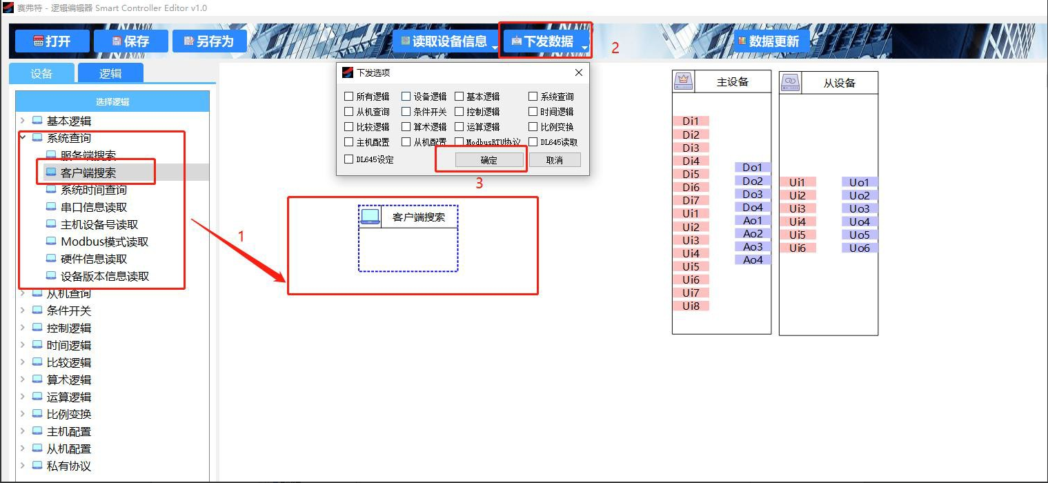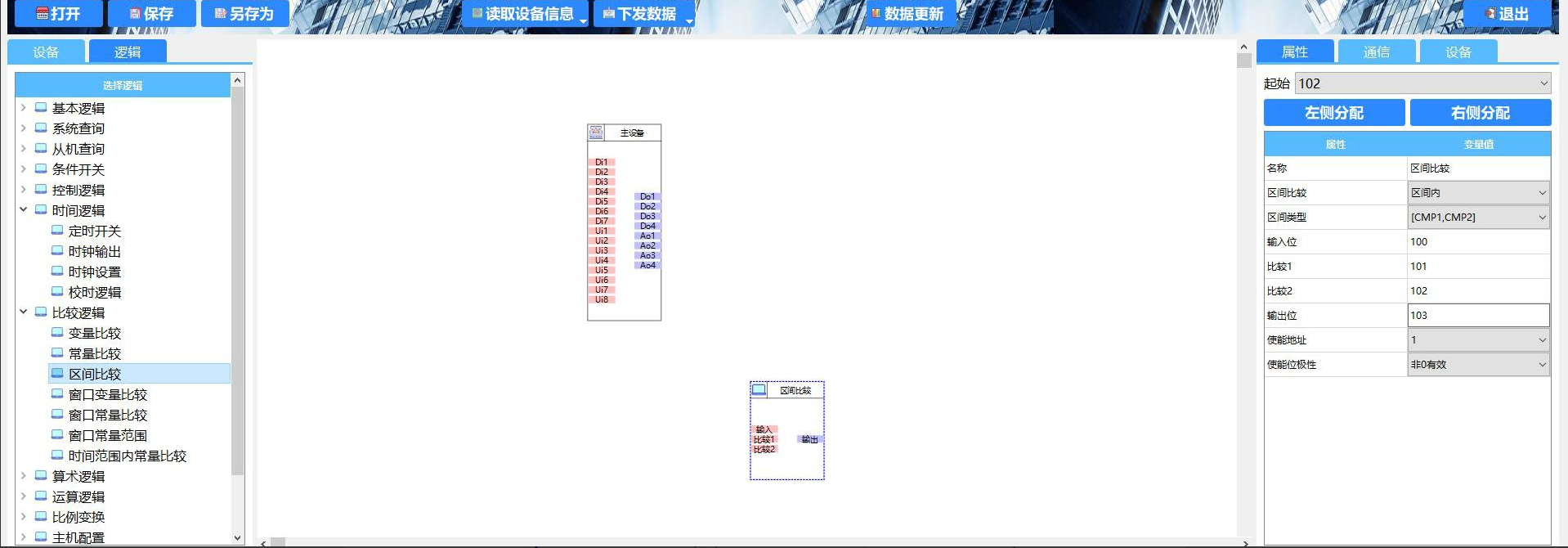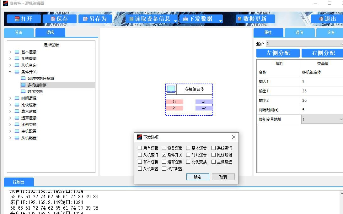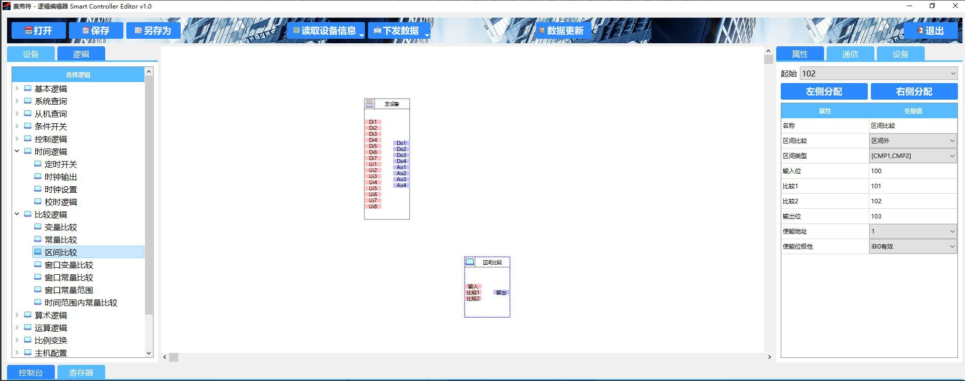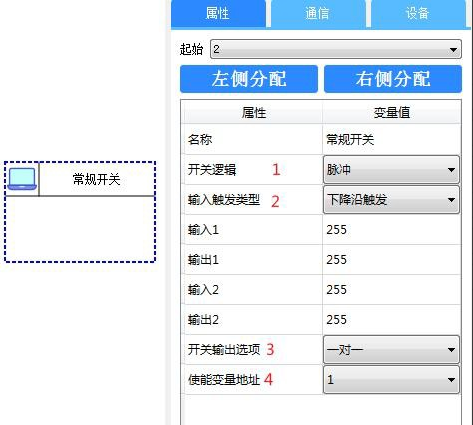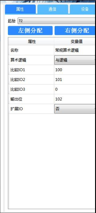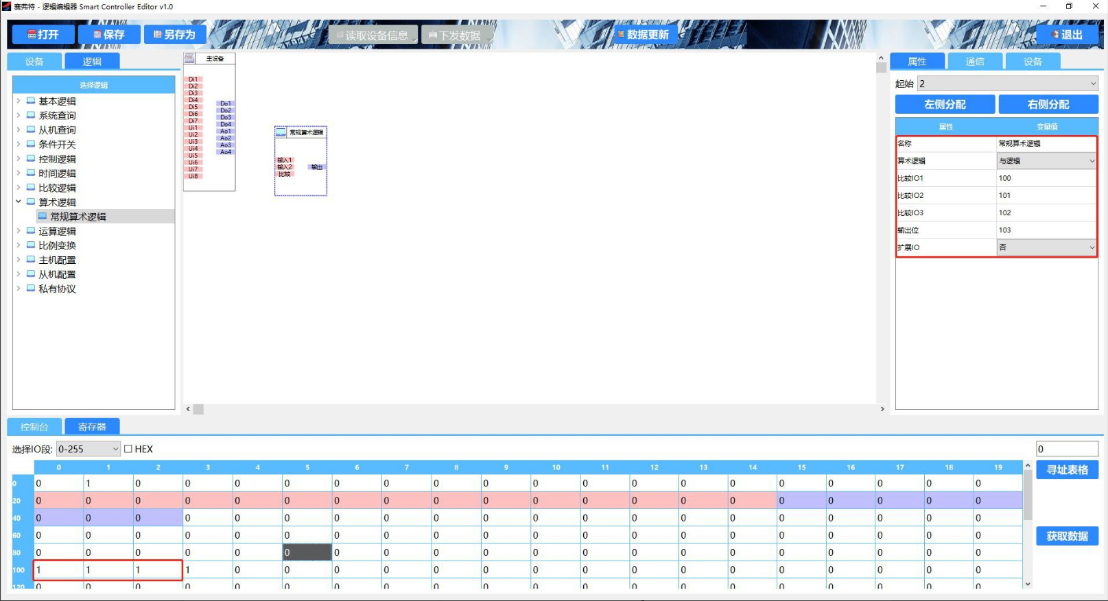 ## 8.1.基本逻辑 ### 8.1.1.常规开关 如图 32 所示  图 32 常规开关设置 ①开关逻辑:该选项主要指DO 的输出类型,脉冲模式表示控制 DO 输出脉冲,置位模式表示控制DO 输出为 1,清零模式表示控制DO输出为 0,取反模式控制 DO 输出为 0/1,取反模式下互锁逻辑才有用。 例:如果两个 DI 变量地址分别为 02 和 03,需要执行 DI2 上升沿和 DI3 上升沿,分别控制DO 变量 10 和 11 输出置位,那么可以进行如下图 33 设置:  图 33 触发类型选择 ②输入触发类型: 上升沿触发 输入正脉冲的时候有效,比如轻触按键按下 下降沿触发 输入负脉冲的时候有效,比如轻触按键释放 长按触发 输入一直保持1的时候才有效,比如轻触按键一直处于按下的状态 双击触发 一般用于按键双击时有效,可以用做清零 短按触发 输入短时间为1的时候才有效 脉冲触发 输入正脉冲/负脉冲的时候有效 ③开关输出选项: 一对一 该选项主要应用于单路/双路 DI 控制 DO 输出,如果用到输入 1 输出 1,那么输入 2 和输出 2 设为 255(无效),如果用到输入 2 输出 2,那么输入 1 和输出 1 设为 255(无效)。 如果要用双路DI 分别控制双路DO 输出,那么输入 1 输出 1,输入 2 输出 2 填入相应的DI 和DO 变量地址即可 用于一条回路输入控制输出或者两条回路输入控制输出 一对任意 该选项主要应用于单路DI 控制两路DO 输出,当输入 1 或输入 2有效时,输出 1 和输出 2 同时触发 一对区间 该选项主要应用于单路DI 控制多路DO 输出,当输入 1 或输入 2有效时,输出变量 1 到输出变量 2 区间所有DO 都触发 互锁输出 该选项主要应用于单路DI 控制两路DO 互锁输出,当输入 1 或输入 2 有效时,输出变量 1 输出 1,输出变量 2 输出 0 联锁输出 该选项主要应用于单路DI 控制两路DO 联锁输出 算是包含关系 ④使能变量地址 当使能变量的值为 1 时才可进行该逻辑操作 ### 8.1.2.继电器互锁 由单路DI 或者多路DI 控制多组DO 互锁输出; 互锁解释:假设 有A、B 两台机组,当机组A 运行时,B 停止运行;B 机组运行时,A停止运行。 场景说明:多回路场景中,利用某一回路的通断去控制其他回路的通断,如图 34 所示;  图 34 继电器互锁 ### 8.1.3.继电器清零 由单路DI 或者双路DI 控制多组DO 输出清零; 由高电位“代表逻辑 1”变为低电位“代表逻辑 0”,如图 35 所示;  图 35 继电器清零 ## 8.2.系统查询 ### 8.2.1.服务端搜索 拖出“服务端搜索”控件,点击“下发数据”按钮,选择“系统查询”进行下发,控制台会显示读取的设备服务器 IP 和端口号信息,如图 36 所示;  图 36 服务端搜索 ### 8.2.2.客户端搜索  图 37 系统时间查询 ### 8.2.3.系统时间查询 如需要查询设备当前时间是否需要校准,可拖出“系统时间查询”控件,点击“下发数据”按钮,选择“系统查询”进行下发,控制台会显示读取的系统时间信息,如图 38 所示;  图 38 系统时间查询 ### 8.2.4.串口信息读取 如需要查询设备串口波特率,可拖出“串口信息读取”控件,属性栏可选择哪一路串口,点击“下发数据”按钮,选择“系统查询”进行下发,控制台会显示读取的串口信息,如图 39 所示;  图 39 串口信息读取 ### 8.2.5.主机设备号读取 如需要查询主机设备号,可拖出“主机设备号读取”控件,点击 “下发数据”按钮,选择“系统查询”进行下发,控制台会显示读取的设备号信息,如图 40 所示;  图 40 主机设备号读取 ### 8.2.6.Modbus 模式读取 如需要查询Modbus 模式,可拖出“Modbus 模式读取”控件,点击“下发数据”按钮,选择“系统查询”进行下发,控制台会显示读取的Modbus 模式信息,如图 41 所示;  图 41 TCP 模式读取 ### 8.2.7.硬件信息读取 如需要查询硬件信息,可拖出“硬件信息读取”控件,点击“下发数据”按钮,选择“系统查询”进行下发,控制台会显示读取的硬件信息;如图 42 所示;  图 42 硬件信息读取 ### 8.2.8.设备版本信息读取 如需要查询设备版本信息,可拖出“设备版本信息读取”控件,点击“下发数据”按钮,选择“系统查询”进行下发,控制台会显示读取的设备版本信息,如图 43 所示;  图 43 设备版本信息 ## 8.3.条件开关 ### 8.3.1.延时控制任意路 该场景 1 个逻辑最多可控制 8 路DO 延时输出,可控制任意几路 DO 输出高/低电平。超过 8 路可以用多个延时逻辑组合,延时时间可设。 控制类型为“单IO 控制开关”时,由输入位 1 DI 控制DO 开关,例如下图设置按键 03 上升沿控制输出偶数变量 10,12,14,16 对应的 DO 口全开/全关,按一次是依次打开,再按一次依次关闭,间隔时间 0.5s,如图 44 所示;  图 44 单IO 控制属性配置 控制类型为“双IO 控制开关”时,由输入位 1 DI 控制 DO 开,由输入位 2 DI 控制 DO 关,例如图设置按键 03 上升沿控制输出奇数变量 11,13,15,17 对应的DO 口全开/全关,按一次是依次打开,再按一次依次关闭,间隔时间 0.5s,如图 45 所示;  图 45 双IO 控制属性配置 ### 8.3.2.多机组启停 该场景主要针对通过某个输入点的触发两个 DO 点间隔一定时间来回开关操作。例如: 用按键输入变量 5 控制两路继电器DO 点 35 和 36 启停,先 35 开 36 关操作,间隔 5s 后执行 36 开 35 关的操作,再按一次按键,继电器全关。 设置如图 46 所示:  图 46 双IO 控制属性配置 ### 8.3.3. 时序控制 如需控制相邻的几路开关输出,第一路和剩余几路延时时间和其他几路延时时间不一样,则可以使用该逻辑进行控制。 案例: 用按键控制 8 组继电器输出,第一路和剩余 7 路间隔时间 2s。其余每路间