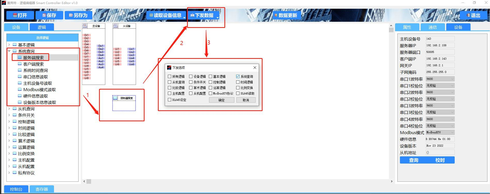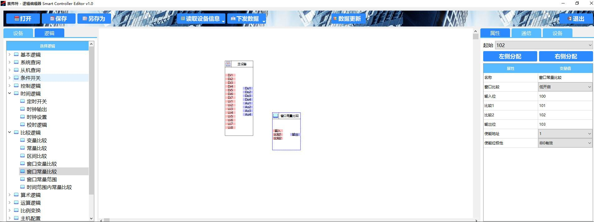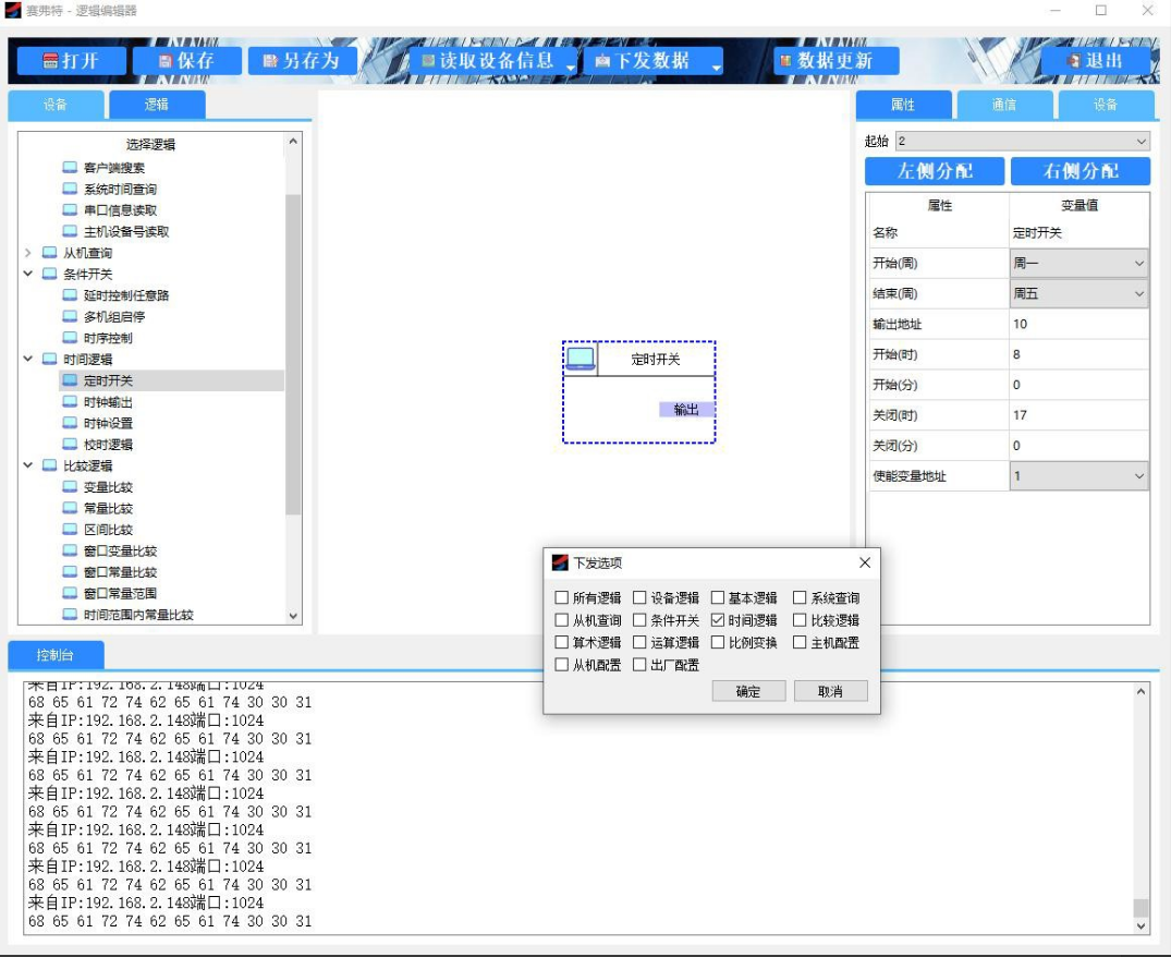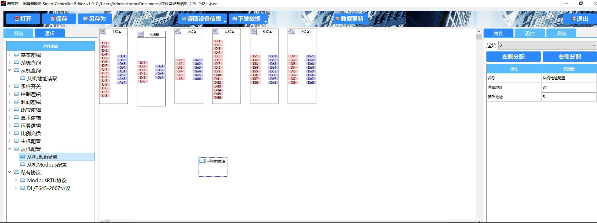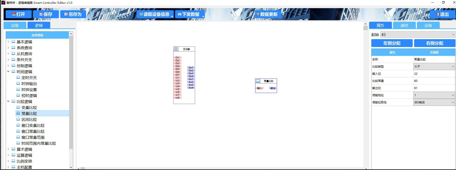 ## 8.1.基本逻辑 ### 8.1.1.常规开关 如图 32 所示  图 32 常规开关设置 ①开关逻辑:该选项主要指DO 的输出类型,脉冲模式表示控制 DO 输出脉冲,置位模式表示控制DO 输出为 1,清零模式表示控制DO输出为 0,取反模式控制 DO 输出为 0/1,取反模式下互锁逻辑才有用。 例:如果两个 DI 变量地址分别为 02 和 03,需要执行 DI2 上升沿和 DI3 上升沿,分别控制DO 变量 10 和 11 输出置位,那么可以进行如下图 33 设置:  图 33 触发类型选择 ②输入触发类型: 上升沿触发 输入正脉冲的时候有效,比如轻触按键按下 下降沿触发 输入负脉冲的时候有效,比如轻触按键释放 长按触发 输入一直保持1的时候才有效,比如轻触按键一直处于按下的状态 双击触发 一般用于按键双击时有效,可以用做清零 短按触发 输入短时间为1的时候才有效 脉冲触发 输入正脉冲/负脉冲的时候有效 ③开关输出选项: 一对一 该选项主要应用于单路/双路 DI 控制 DO 输出,如果用到输入 1 输出 1,那么输入 2 和输出 2 设为 255(无效),如果用到输入 2 输出 2,那么输入 1 和输出 1 设为 255(无效)。 如果要用双路DI 分别控制双路DO 输出,那么输入 1 输出 1,输入 2 输出 2 填入相应的DI 和DO 变量地址即可 用于一条回路输入控制输出或者两条回路输入控制输出 一对任意 该选项主要应用于单路DI 控制两路DO 输出,当输入 1 或输入 2有效时,输出 1 和输出 2 同时触发 一对区间 该选项主要应用于单路DI 控制多路DO 输出,当输入 1 或输入 2有效时,输出变量 1 到输出变量 2 区间所有DO 都触发 互锁输出 该选项主要应用于单路DI 控制两路DO 互锁输出,当输入 1 或输入 2 有效时,输出变量 1 输出 1,输出变量 2 输出 0 联锁输出 该选项主要应用于单路DI 控制两路DO 联锁输出 算是包含关系 ④使能变量地址 当使能变量的值为 1 时才可进行该逻辑操作 ### 8.1.2.继电器互锁 由单路DI 或者多路DI 控制多组DO 互锁输出; 互锁解释:假设 有A、B 两台机组,当机组A 运行时,B 停止运行;B 机组运行时,A停止运行。 场景说明:多回路场景中,利用某一回路的通断去控制其他回路的通断,如图 34 所示;  图 34 继电器互锁 ### 8.1.3.继电器清零 由单路DI 或者双路DI 控制多组DO 输出清零; 由高电位“代表逻辑 1”变为低电位“代表逻辑 0”,如图 35 所示;  图 35 继电器清零 ## 8.2.系统查询 ### 8.2.1.服务端搜索 拖出“服务端搜索”控件,点击“下发数据”按钮,选择“系统查询”进行下发,控制台会显示读取的设备服务器 IP 和端口号信息,如图 36 所示;  图 36 服务端搜索 ### 8.2.2.客户端搜索  图 37 系统时间查询 ### 8.2.3.系统时间查询 如需要查询设备当前时间是否需要校准,可拖出“系统时间查询”控件,点击“下发数据”按钮,选择“系统查询”进行下发,控制台会显示读取的系统时间信息,如图 38 所示;  图 38 系统时间查询 ### 8.2.4.串口信息读取 如需要查询设备串口波特率,可拖出“串口信息读取”控件,属性栏可选择哪一路串口,点击“下发数据”按钮,选择“系统查询”进行下发,控制台会显示读取的串口信息,如图 39 所示;  图 39 串口信息读取 ### 8.2.5.主机设备号读取 如需要查询主机设备号,可拖出“主机设备号读取”控件,点击 “下发数据”按钮,选择“系统查询”进行下发,控制台会显示读取的设备号信息,如图 40 所示;  图 40 主机设备号读取 ### 8.2.6.Modbus 模式读取 如需要查询Modbus 模式,可拖出“Modbus 模式读取”控件,点击“下发数据”按钮,选择“系统查询”进行下发,控制台会显示读取的Modbus 模式信息,如图 41 所示;  图 41 TCP 模式读取 ### 8.2.7.硬件信息读取 如需要查询硬件信息,可拖出“硬件信息读取”控件,点击“下发数据”按钮,选择“系统查询”进行下发,控制台会显示读取的硬件信息;如图 42 所示;  图 42 硬件信息读取 ### 8.2.8.设备版本信息读取 如需要查询设备版本信息,可拖出“设备版本信息读取”控件,点击“下发数据”按钮,选择“系统查询”进行下发,控制台会显示读取的设备版本信息,如图 43 所示;  图 43 设备版本信息 ## 8.3.条件开关 ### 8.3.1.延时控制任意路 该场景 1 个逻辑最多可控制 8 路DO 延时输出,可控制任意几路 DO 输出高/低电平。超过 8 路可以用多个延时逻辑组合,延时时间可设。 控制类型为“单IO 控制开关”时,由输入位 1 DI 控制DO 开关,例如下图设置按键 03 上升沿控制输出偶数变量 10,12,14,16 对应的 DO 口全开/全关,按一次是依次打开,再按一次依次关闭,间隔时间 0.5s,如图 44 所示;  图 44 单IO 控制属性配置 控制类型为“双IO 控制开关”时,由输入位 1 DI 控制 DO 开,由输入位 2 DI 控制 DO 关,例如图设置按键 03 上升沿控制输出奇数变量 11,13,15,17 对应的DO 口全开/全关,按一次是依次打开,再按一次依次关闭,间隔时间 0.5s,如图 45 所示;  图 45 双IO 控制属性配置 ### 8.3.2.多机组启停 该场景主要针对通过某个输入点的触发两个 DO 点间隔一定时间来回开关操作。例如: 用按键输入变量 5 控制两路继电器DO 点 35 和 36 启停,先 35 开 36 关操作,间隔 5s 后执行 36 开 35 关的操作,再按一次按键,继电器全关。 设置如图 46 所示:  图 46 双IO 控制属性配置 ### 8.3.3. 时序控制 如需控制相邻的几路开关输出,第一路和剩余几路延时时间和其他几路延时时间不一样,则可以使用该逻辑进行控制。 案例: 用按键控制 8 组继电器输出,第一路和剩余 7 路间隔时间 2s。其余每路间