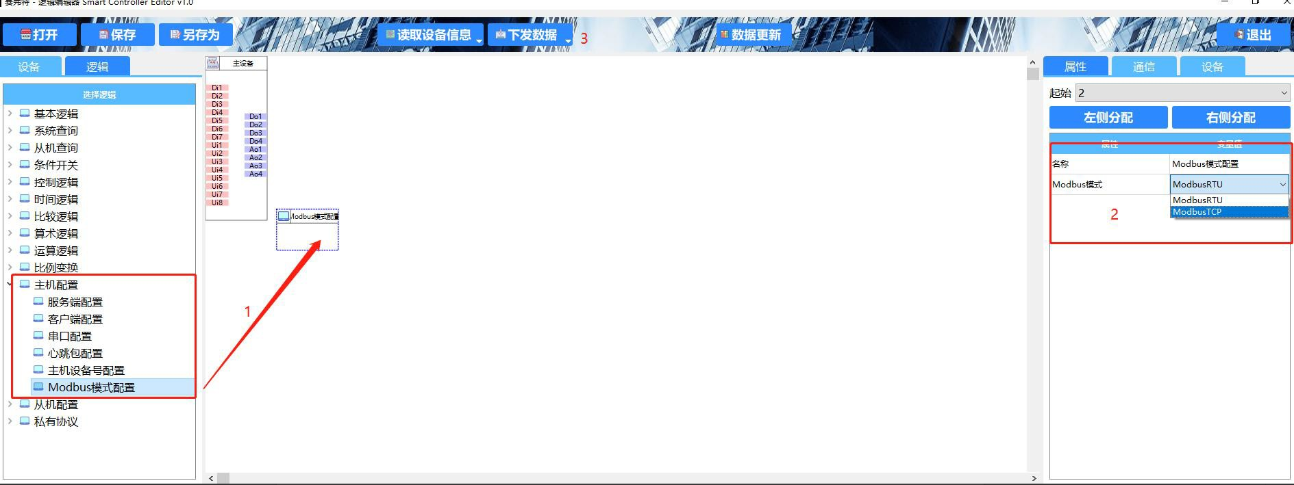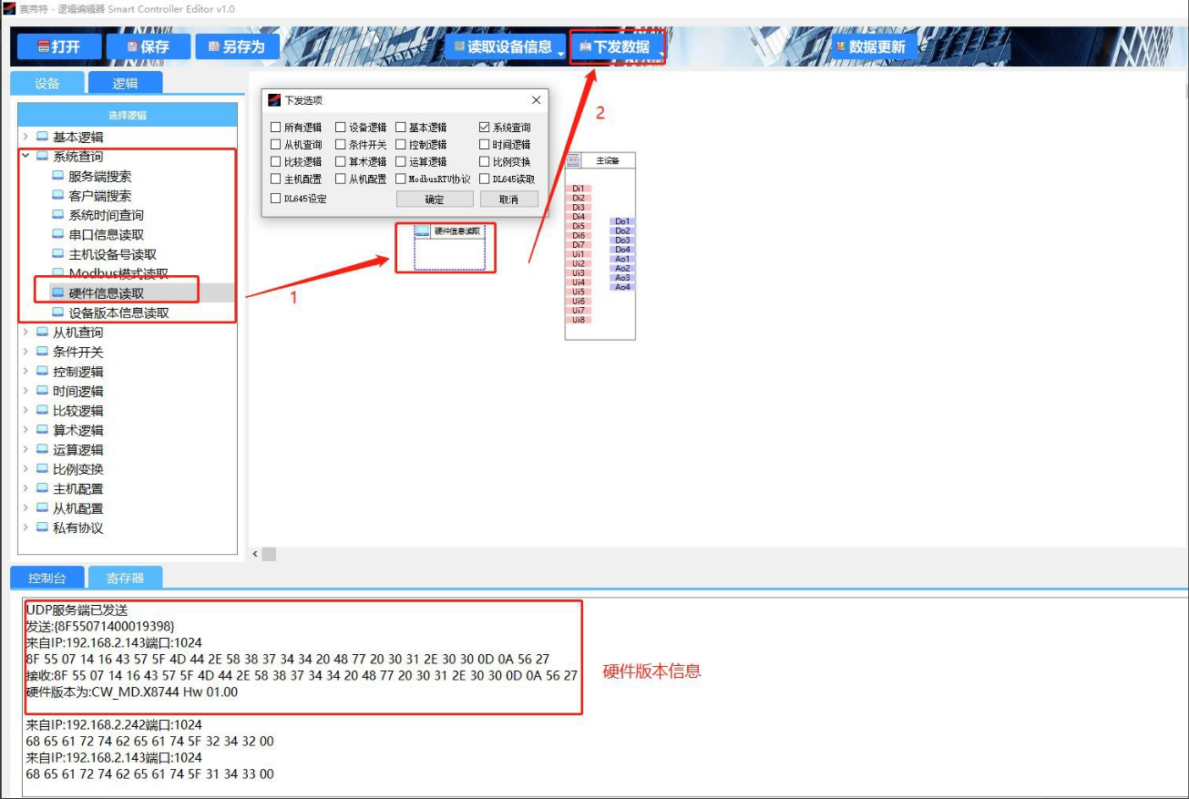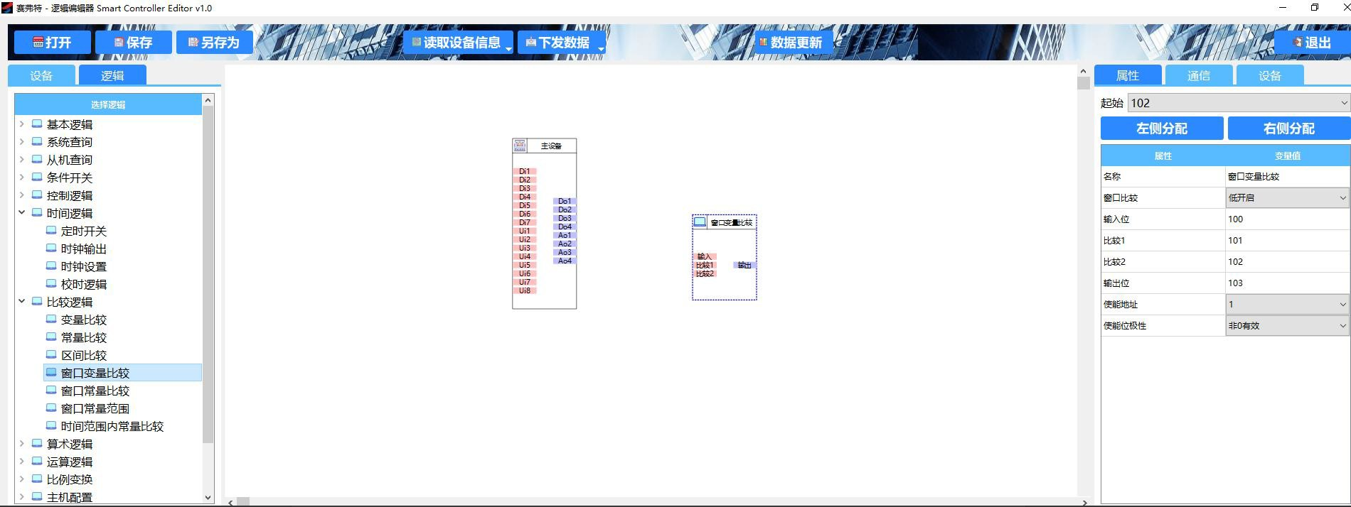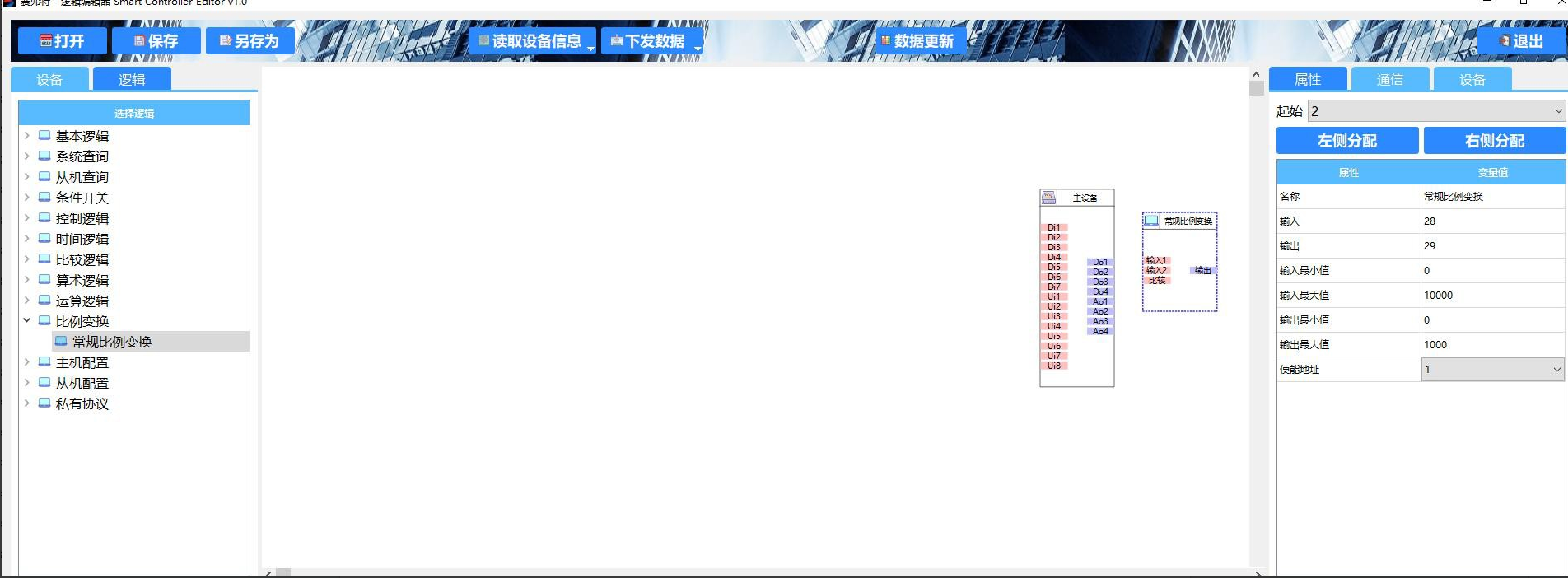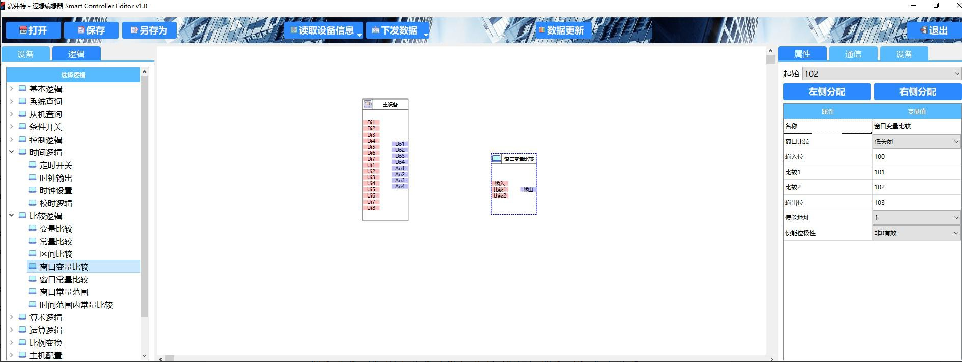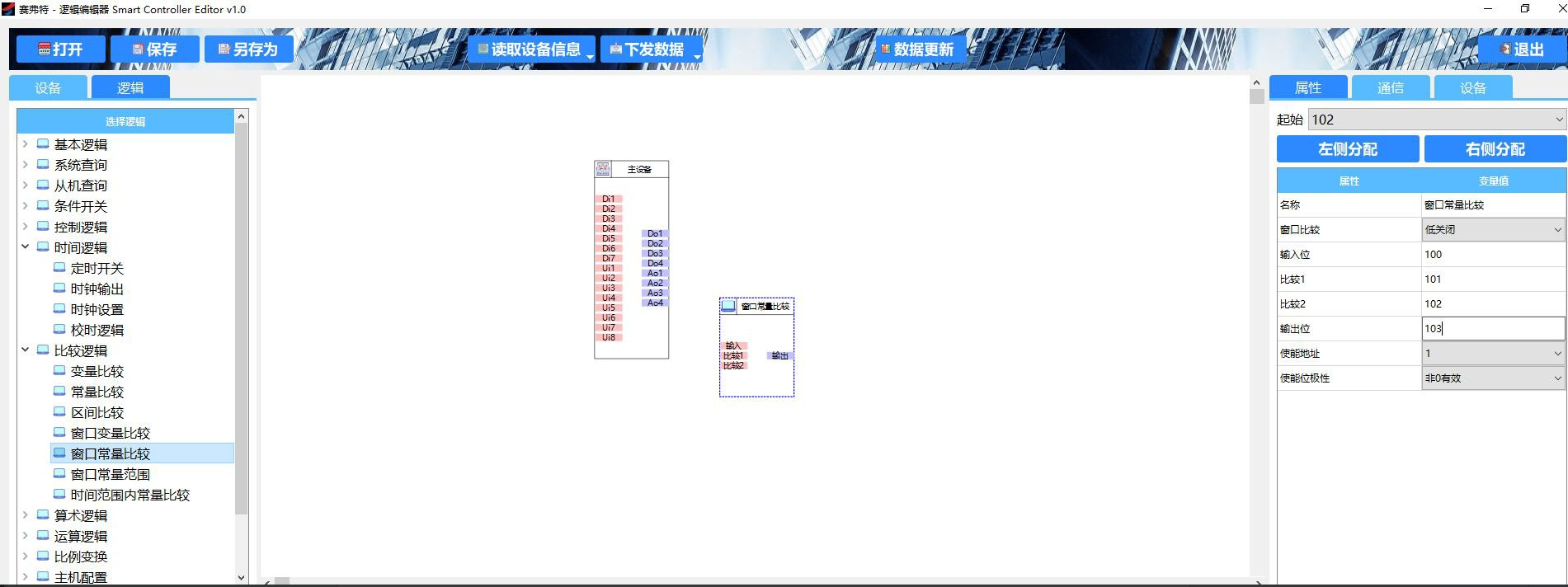 ## 8.1.基本逻辑 ### 8.1.1.常规开关 如图 32 所示  图 32 常规开关设置 ①开关逻辑:该选项主要指DO 的输出类型,脉冲模式表示控制 DO 输出脉冲,置位模式表示控制DO 输出为 1,清零模式表示控制DO输出为 0,取反模式控制 DO 输出为 0/1,取反模式下互锁逻辑才有用。 例:如果两个 DI 变量地址分别为 02 和 03,需要执行 DI2 上升沿和 DI3 上升沿,分别控制DO 变量 10 和 11 输出置位,那么可以进行如下图 33 设置:  图 33 触发类型选择 ②输入触发类型: 上升沿触发 输入正脉冲的时候有效,比如轻触按键按下 下降沿触发 输入负脉冲的时候有效,比如轻触按键释放 长按触发 输入一直保持1的时候才有效,比如轻触按键一直处于按下的状态 双击触发 一般用于按键双击时有效,可以用做清零 短按触发 输入短时间为1的时候才有效 脉冲触发 输入正脉冲/负脉冲的时候有效 ③开关输出选项: 一对一 该选项主要应用于单路/双路 DI 控制 DO 输出,如果用到输入 1 输出 1,那么输入 2 和输出 2 设为 255(无效),如果用到输入 2 输出 2,那么输入 1 和输出 1 设为 255(无效)。 如果要用双路DI 分别控制双路DO 输出,那么输入 1 输出 1,输入 2 输出 2 填入相应的DI 和DO 变量地址即可 用于一条回路输入控制输出或者两条回路输入控制输出 一对任意 该选项主要应用于单路DI 控制两路DO 输出,当输入 1 或输入 2有效时,输出 1 和输出 2 同时触发 一对区间 该选项主要应用于单路DI 控制多路DO 输出,当输入 1 或输入 2有效时,输出变量 1 到输出变量 2 区间所有DO 都触发 互锁输出 该选项主要应用于单路DI 控制两路DO 互锁输出,当输入 1 或输入 2 有效时,输出变量 1 输出 1,输出变量 2 输出 0 联锁输出 该选项主要应用于单路DI 控制两路DO 联锁输出 算是包含关系 ④使能变量地址 当使能变量的值为 1 时才可进行该逻辑操作 ### 8.1.2.继电器互锁 由单路DI 或者多路DI 控制多组DO 互锁输出; 互锁解释:假设 有A、B 两台机组,当机组A 运行时,B 停止运行;B 机组运行时,A停止运行。 场景说明:多回路场景中,利用某一回路的通断去控制其他回路的通断,如图 34 所示;  图 34 继电器互锁 ### 8.1.3.继电器清零 由单路DI 或者双路DI 控制多组DO 输出清零; 由高电位“代表逻辑 1”变为低电位“代表逻辑 0”,如图 35 所示;  图 35 继电器清零 ## 8.2.系统查询 ### 8.2.1.服务端搜索 拖出“服务端搜索”控件,点击“下发数据”按钮,选择“系统查询”进行下发,控制台会显示读取的设备服务器 IP 和端口号信息,如图 36 所示;  图 36 服务端搜索 ### 8.2.2.客户端搜索  图 37 系统时间查询 ### 8.2.3.系统时间查询 如需要查询设备当前时间是否需要校准,可拖出“系统时间查询”控件,点击“下发数据”按钮,选择“系统查询”进行下发,控制台会显示读取的系统时间信息,如图 38 所示;  图 38 系统时间查询 ### 8.2.4.串口信息读取 如需要查询设备串口波特率,可拖出“串口信息读取”控件,属性栏可选择哪一路串口,点击“下发数据”按钮,选择“系统查询”进行下发,控制台会显示读取的串口信息,如图 39 所示;  图 39 串口信息读取 ### 8.2.5.主机设备号读取 如需要查询主机设备号,可拖出“主机设备号读取”控件,点击 “下发数据”按钮,选择“系统查询”进行下发,控制台会显示读取的设备号信息,如图 40 所示;  图 40 主机设备号读取 ### 8.2.6.Modbus 模式读取 如需要查询Modbus 模式,可拖出“Modbus 模式读取”控件,点击“下发数据”按钮,选择“系统查询”进行下发,控制台会显示读取的Modbus 模式信息,如图 41 所示;  图 41 TCP 模式读取 ### 8.2.7.硬件信息读取 如需要查询硬件信息,可拖出“硬件信息读取”控件,点击“下发数据”按钮,选择“系统查询”进行下发,控制台会显示读取的硬件信息;如图 42 所示;  图 42 硬件信息读取 ### 8.2.8.设备版本信息读取 如需要查询设备版本信息,可拖出“设备版本信息读取”控件,点击“下发数据”按钮,选择“系统查询”进行下发,控制台会显示读取的设备版本信息,如图 43 所示;  图 43 设备版本信息 ## 8.3.条件开关 ### 8.3.1.延时控制任意路 该场景 1 个逻辑最多可控制 8 路DO 延时输出,可控制任意几路 DO 输出高/低电平。超过 8 路可以用多个延时逻辑组合,延时时间可设。 控制类型为“单IO 控制开关”时,由输入位 1 DI 控制DO 开关,例如下图设置按键 03 上升沿控制输出偶数变量 10,12,14,16 对应的 DO 口全开/全关,按一次是依次打开,再按一次依次关闭,间隔时间 0.5s,如图 44 所示;  图 44 单IO 控制属性配置 控制类型为“双IO 控制开关”时,由输入位 1 DI 控制 DO 开,由输入位 2 DI 控制 DO 关,例如图设置按键 03 上升沿控制输出奇数变量 11,13,15,17 对应的DO 口全开/全关,按一次是依次打开,再按一次依次关闭,间隔时间 0.5s,如图 45 所示;  图 45 双IO 控制属性配置 ### 8.3.2.多机组启停 该场景主要针对通过某个输入点的触发两个 DO 点间隔一定时间来回开关操作。例如: 用按键输入变量 5 控制两路继电器DO 点 35 和 36 启停,先 35 开 36 关操作,间隔 5s 后执行 36 开 35 关的操作,再按一次按键,继电器全关。 设置如图 46 所示:  图 46 双IO 控制属性配置 ### 8.3.3. 时序控制 如需控制相邻的几路开关输出,第一路和剩余几路延时时间和其他几路延时时间不一样,则可以使用该逻辑进行控制。 案例: 用按键控制 8 组继电器输出,第一路和剩余 7 路间隔时间 2s。其余每路间