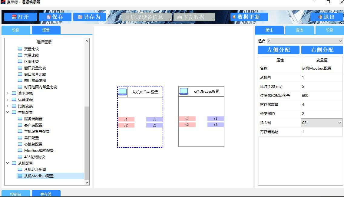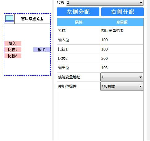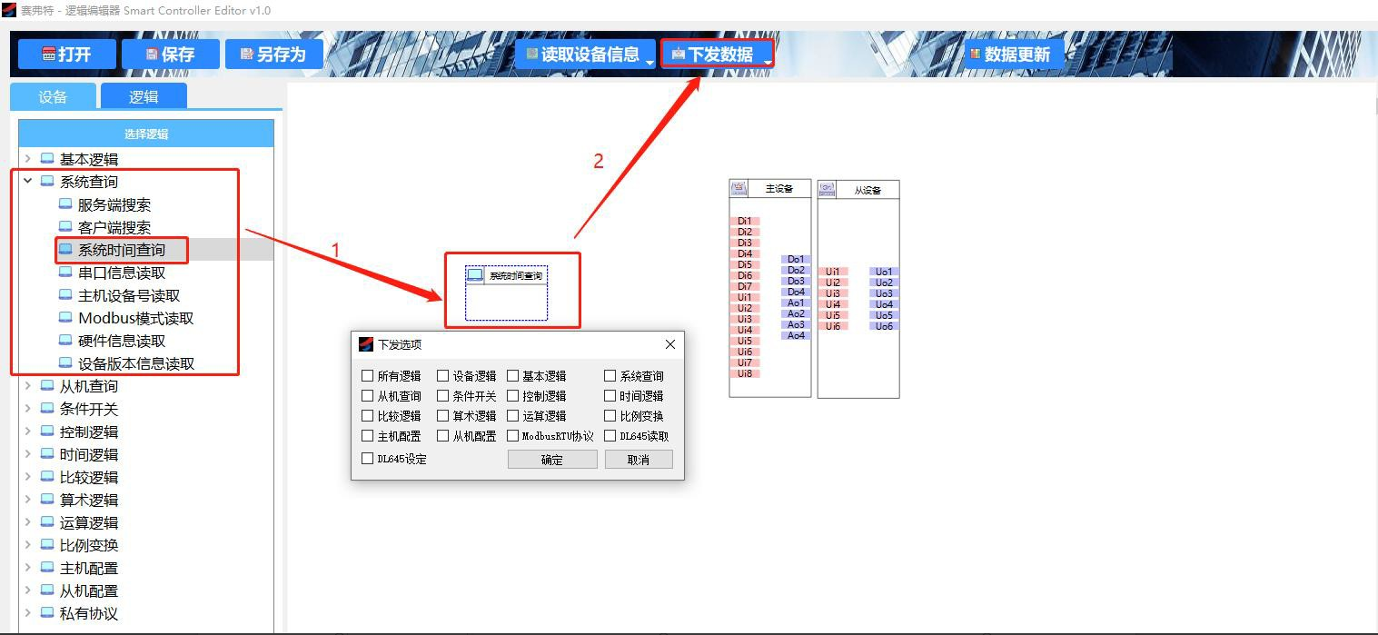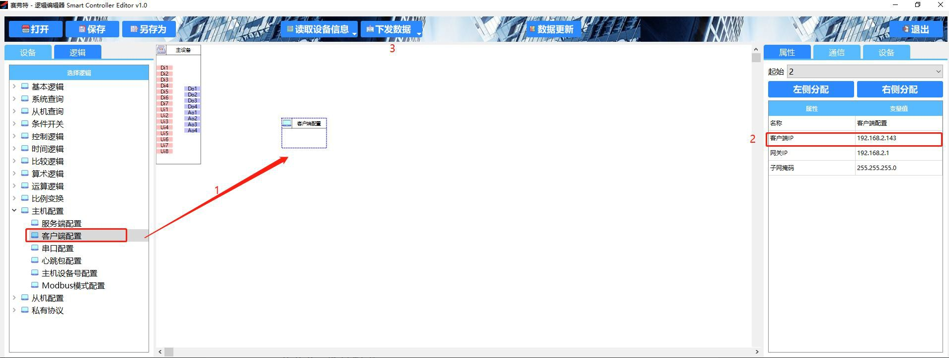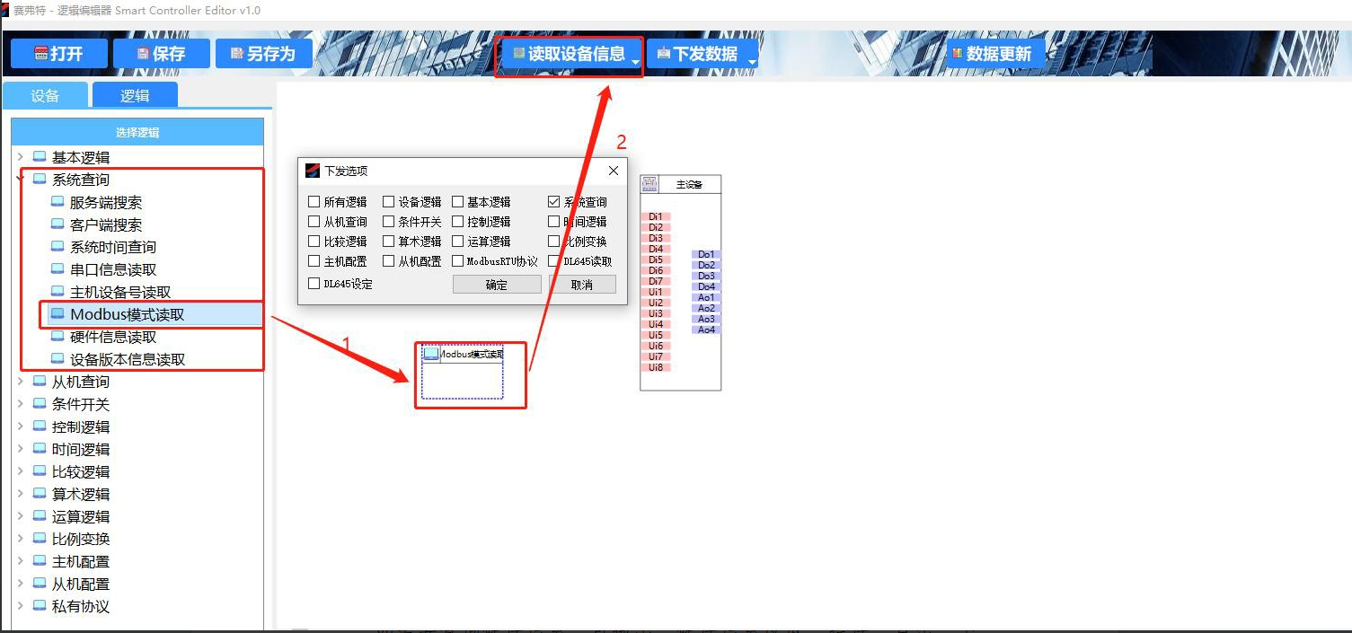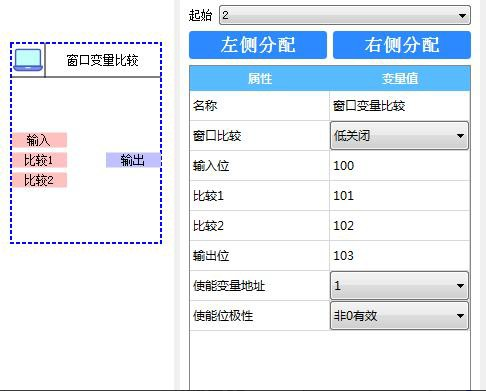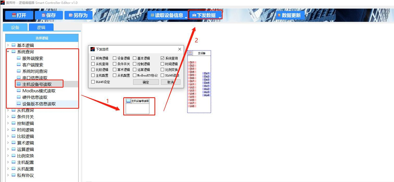## 8.1.基本逻辑 ### 8.1.1.常规开关 如图 32 所示  图 32 常规开关设置 ①开关逻辑:该选项主要指DO 的输出类型,脉冲模式表示控制 DO 输出脉冲,置位模式表示控制DO 输出为 1,清零模式表示控制DO输出为 0,取反模式控制 DO 输出为 0/1,取反模式下互锁逻辑才有用。 例:如果两个 DI 变量地址分别为 02 和 03,需要执行 DI2 上升沿和 DI3 上升沿,分别控制DO 变量 10 和 11 输出置位,那么可以进行如下图 33 设置:  图 33 触发类型选择 ②输入触发类型: 上升沿触发 输入正脉冲的时候有效,比如轻触按键按下 下降沿触发 输入负脉冲的时候有效,比如轻触按键释放 长按触发 输入一直保持1的时候才有效,比如轻触按键一直处于按下的状态 双击触发 一般用于按键双击时有效,可以用做清零 短按触发 输入短时间为1的时候才有效 脉冲触发 输入正脉冲/负脉冲的时候有效 ③开关输出选项: 一对一 该选项主要应用于单路/双路 DI 控制 DO 输出,如果用到输入 1 输出 1,那么输入 2 和输出 2 设为 255(无效),如果用到输入 2 输出 2,那么输入 1 和输出 1 设为 255(无效)。 如果要用双路DI 分别控制双路DO 输出,那么输入 1 输出 1,输入 2 输出 2 填入相应的DI 和DO 变量地址即可 用于一条回路输入控制输出或者两条回路输入控制输出 一对任意 该选项主要应用于单路DI 控制两路DO 输出,当输入 1 或输入 2有效时,输出 1 和输出 2 同时触发 一对区间 该选项主要应用于单路DI 控制多路DO 输出,当输入 1 或输入 2有效时,输出变量 1 到输出变量 2 区间所有DO 都触发 互锁输出 该选项主要应用于单路DI 控制两路DO 互锁输出,当输入 1 或输入 2 有效时,输出变量 1 输出 1,输出变量 2 输出 0 联锁输出 该选项主要应用于单路DI 控制两路DO 联锁输出 算是包含关系 ④使能变量地址 当使能变量的值为 1 时才可进行该逻辑操作 ### 8.1.2.继电器互锁 由单路DI 或者多路DI 控制多组DO 互锁输出; 互锁解释:假设 有A、B 两台机组,当机组A 运行时,B 停止运行;B 机组运行时,A停止运行。 场景说明:多回路场景中,利用某一回路的通断去控制其他回路的通断,如图 34 所示;  图 34 继电器互锁 ### 8.1.3.继电器清零 由单路DI 或者双路DI 控制多组DO 输出清零; 由高电位“代表逻辑 1”变为低电位“代表逻辑 0”,如图 35 所示;  图 35 继电器清零 ## 8.2.系统查询 ### 8.2.1.服务端搜索 拖出“服务端搜索”控件,点击“下发数据”按钮,选择“系统查询”进行下发,控制台会显示读取的设备服务器 IP 和端口号信息,如图 36 所示;  图 36 服务端搜索 ### 8.2.2.客户端搜索  图 37 系统时间查询 ### 8.2.3.系统时间查询 如需要查询设备当前时间是否需要校准,可拖出“系统时间查询”控件,点击“下发数据”按钮,选择“系统查询”进行下发,控制台会显示读取的系统时间信息,如图 38 所示;  图 38 系统时间查询 ### 8.2.4.串口信息读取 如需要查询设备串口波特率,可拖出“串口信息读取”控件,属性栏可选择哪一路串口,点击“下发数据”按钮,选择“系统查询”进行下发,控制台会显示读取的串口信息,如图 39 所示;  图 39 串口信息读取 ### 8.2.5.主机设备号读取 如需要查询主机设备号,可拖出“主机设备号读取”控件,点击 “下发数据”按钮,选择“系统查询”进行下发,控制台会显示读取的设备号信息,如图 40 所示;  图 40 主机设备号读取 ### 8.2.6.Modbus 模式读取 如需要查询Modbus 模式,可拖出“Modbus 模式读取”控件,点击“下发数据”按钮,选择“系统查询”进行下发,控制台会显示读取的Modbus 模式信息,如图 41 所示;  图 41 TCP 模式读取 ### 8.2.7.硬件信息读取 如需要查询硬件信息,可拖出“硬件信息读取”控件,点击“下发数据”按钮,选择“系统查询”进行下发,控制台会显示读取的硬件信息;如图 42 所示;  图 42 硬件信息读取 ### 8.2.8.设备版本信息读取 如需要查询设备版本信息,可拖出“设备版本信息读取”控件,点击“下发数据”按钮,选择“系统查询”进行下发,控制台会显示读取的设备版本信息,如图 43 所示;  图 43 设备版本信息 ## 8.3.条件开关 ### 8.3.1.延时控制任意路 该场景 1 个逻辑最多可控制 8 路DO 延时输出,可控制任意几路 DO 输出高/低电平。超过 8 路可以用多个延时逻辑组合,延时时间可设。 控制类型为“单IO 控制开关”时,由输入位 1 DI 控制DO 开关,例如下图设置按键 03 上升沿控制输出偶数变量 10,12,14,16 对应的 DO 口全开/全关,按一次是依次打开,再按一次依次关闭,间隔时间 0.5s,如图 44 所示;  图 44 单IO 控制属性配置 控制类型为“双IO 控制开关”时,由输入位 1 DI 控制 DO 开,由输入位 2 DI 控制 DO 关,例如图设置按键 03 上升沿控制输出奇数变量 11,13,15,17 对应的DO 口全开/全关,按一次是依次打开,再按一次依次关闭,间隔时间 0.5s,如图 45 所示;  图 45 双IO 控制属性配置 ### 8.3.2.多机组启停 该场景主要针对通过某个输入点的触发两个 DO 点间隔一定时间来回开关操作。例如: 用按键输入变量 5 控制两路继电器DO 点 35 和 36 启停,先 35 开 36 关操作,间隔 5s 后执行 36 开 35 关的操作,再按一次按键,继电器全关。 设置如图 46 所示:  图 46 双IO 控制属性配置 ### 8.3.3. 时序控制 如需控制相邻的几路开关输出,第一路和剩余几路延时时间和其他几路延时时间不一样,则可以使用该逻辑进行控制。 案例: 用按键控制 8 组继电器输出,第一路和剩余 7 路间隔时间 2s。其余每路间