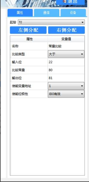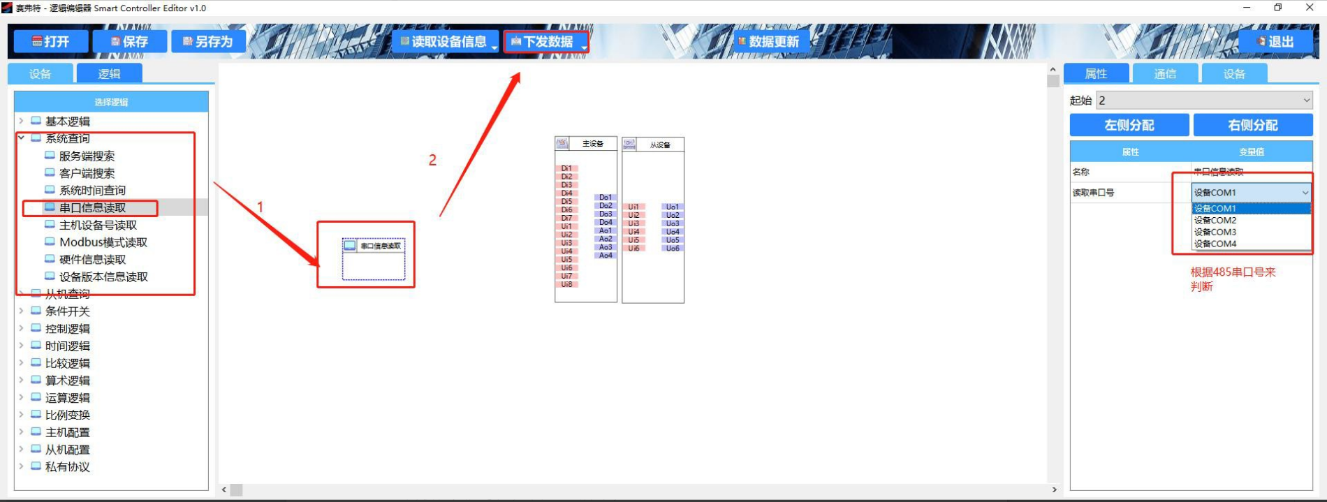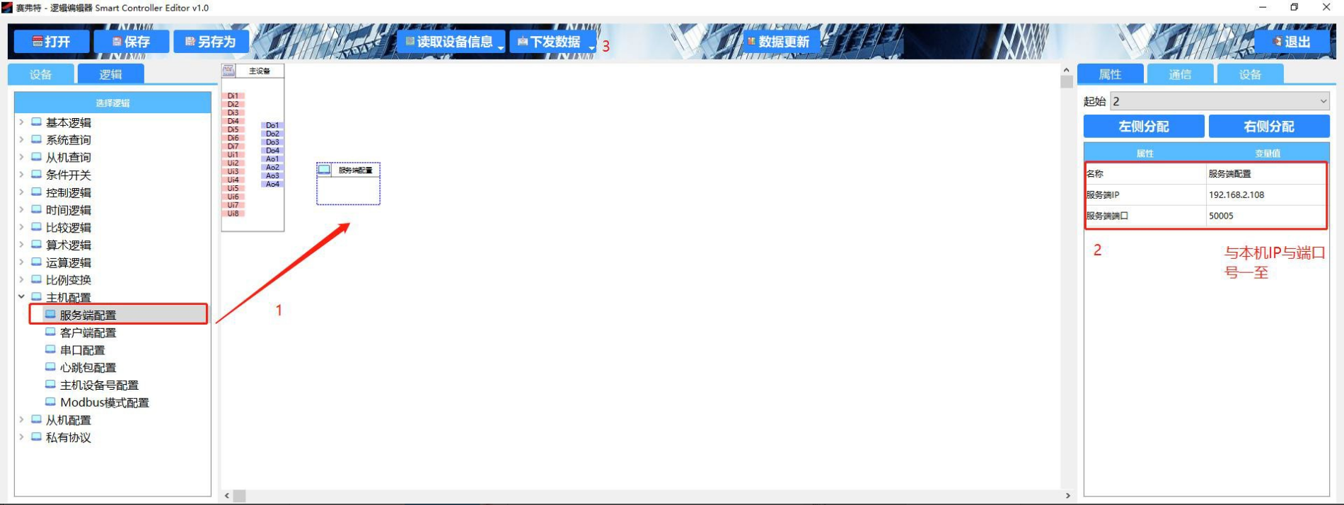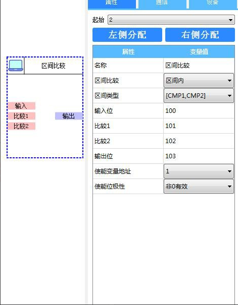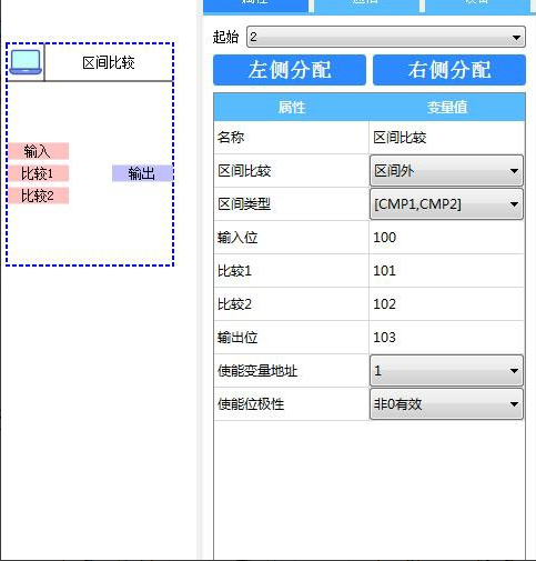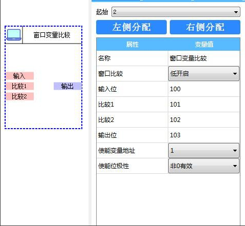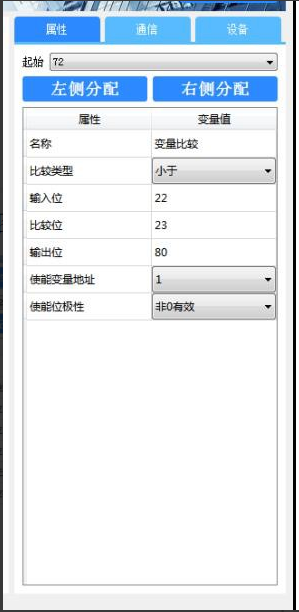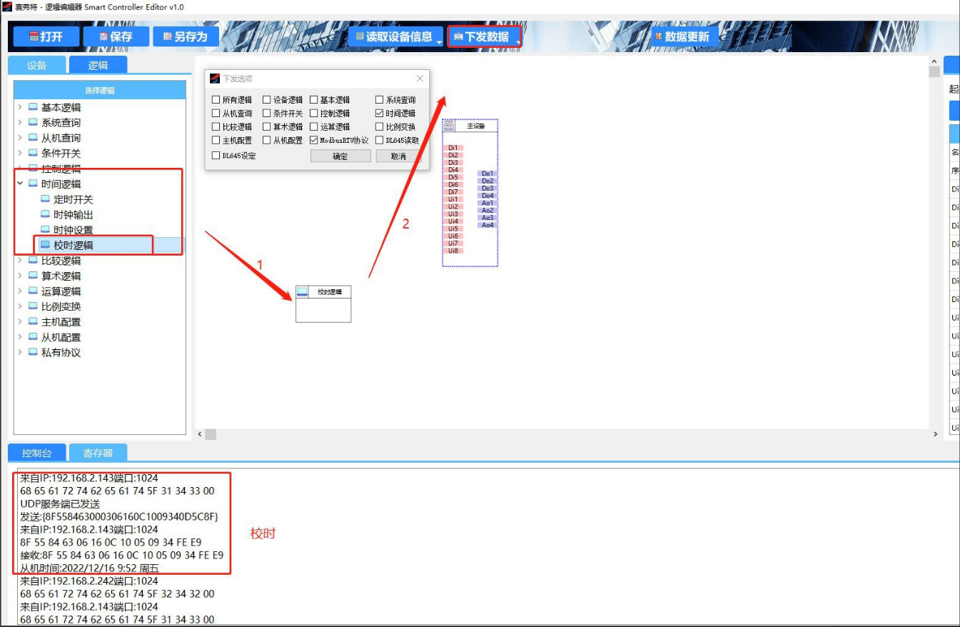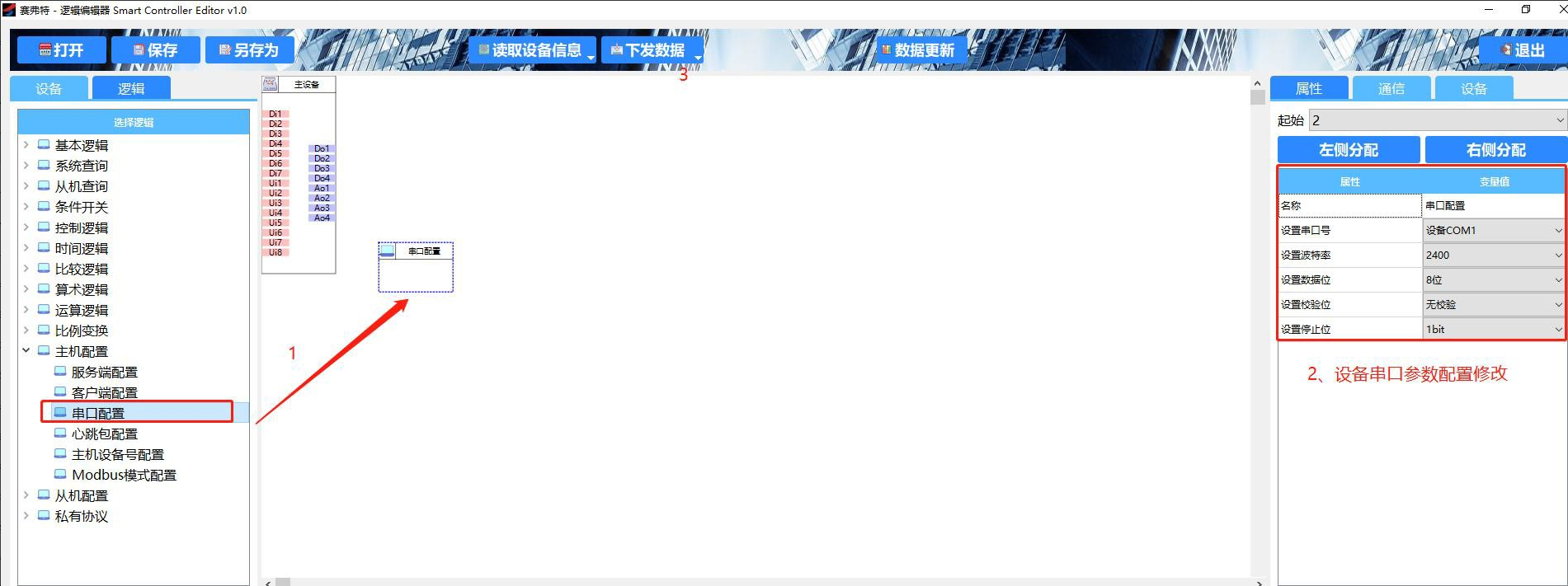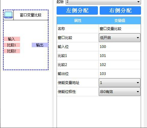 ## 8.1.基本逻辑 ### 8.1.1.常规开关 如图 32 所示  图 32 常规开关设置 ①开关逻辑:该选项主要指DO 的输出类型,脉冲模式表示控制 DO 输出脉冲,置位模式表示控制DO 输出为 1,清零模式表示控制DO输出为 0,取反模式控制 DO 输出为 0/1,取反模式下互锁逻辑才有用。 例:如果两个 DI 变量地址分别为 02 和 03,需要执行 DI2 上升沿和 DI3 上升沿,分别控制DO 变量 10 和 11 输出置位,那么可以进行如下图 33 设置:  图 33 触发类型选择 ②输入触发类型: 上升沿触发 输入正脉冲的时候有效,比如轻触按键按下 下降沿触发 输入负脉冲的时候有效,比如轻触按键释放 长按触发 输入一直保持1的时候才有效,比如轻触按键一直处于按下的状态 双击触发 一般用于按键双击时有效,可以用做清零 短按触发 输入短时间为1的时候才有效 脉冲触发 输入正脉冲/负脉冲的时候有效 ③开关输出选项: 一对一 该选项主要应用于单路/双路 DI 控制 DO 输出,如果用到输入 1 输出 1,那么输入 2 和输出 2 设为 255(无效),如果用到输入 2 输出 2,那么输入 1 和输出 1 设为 255(无效)。 如果要用双路DI 分别控制双路DO 输出,那么输入 1 输出 1,输入 2 输出 2 填入相应的DI 和DO 变量地址即可 用于一条回路输入控制输出或者两条回路输入控制输出 一对任意 该选项主要应用于单路DI 控制两路DO 输出,当输入 1 或输入 2有效时,输出 1 和输出 2 同时触发 一对区间 该选项主要应用于单路DI 控制多路DO 输出,当输入 1 或输入 2有效时,输出变量 1 到输出变量 2 区间所有DO 都触发 互锁输出 该选项主要应用于单路DI 控制两路DO 互锁输出,当输入 1 或输入 2 有效时,输出变量 1 输出 1,输出变量 2 输出 0 联锁输出 该选项主要应用于单路DI 控制两路DO 联锁输出 算是包含关系 ④使能变量地址 当使能变量的值为 1 时才可进行该逻辑操作 ### 8.1.2.继电器互锁 由单路DI 或者多路DI 控制多组DO 互锁输出; 互锁解释:假设 有A、B 两台机组,当机组A 运行时,B 停止运行;B 机组运行时,A停止运行。 场景说明:多回路场景中,利用某一回路的通断去控制其他回路的通断,如图 34 所示;  图 34 继电器互锁 ### 8.1.3.继电器清零 由单路DI 或者双路DI 控制多组DO 输出清零; 由高电位“代表逻辑 1”变为低电位“代表逻辑 0”,如图 35 所示;  图 35 继电器清零 ## 8.2.系统查询 ### 8.2.1.服务端搜索 拖出“服务端搜索”控件,点击“下发数据”按钮,选择“系统查询”进行下发,控制台会显示读取的设备服务器 IP 和端口号信息,如图 36 所示;  图 36 服务端搜索 ### 8.2.2.客户端搜索  图 37 系统时间查询 ### 8.2.3.系统时间查询 如需要查询设备当前时间是否需要校准,可拖出“系统时间查询”控件,点击“下发数据”按钮,选择“系统查询”进行下发,控制台会显示读取的系统时间信息,如图 38 所示;  图 38 系统时间查询 ### 8.2.4.串口信息读取 如需要查询设备串口波特率,可拖出“串口信息读取”控件,属性栏可选择哪一路串口,点击“下发数据”按钮,选择“系统查询”进行下发,控制台会显示读取的串口信息,如图 39 所示;  图 39 串口信息读取 ### 8.2.5.主机设备号读取 如需要查询主机设备号,可拖出“主机设备号读取”控件,点击 “下发数据”按钮,选择“系统查询”进行下发,控制台会显示读取的设备号信息,如图 40 所示;  图 40 主机设备号读取 ### 8.2.6.Modbus 模式读取 如需要查询Modbus 模式,可拖出“Modbus 模式读取”控件,点击“下发数据”按钮,选择“系统查询”进行下发,控制台会显示读取的Modbus 模式信息,如图 41 所示;  图 41 TCP 模式读取 ### 8.2.7.硬件信息读取 如需要查询硬件信息,可拖出“硬件信息读取”控件,点击“下发数据”按钮,选择“系统查询”进行下发,控制台会显示读取的硬件信息;如图 42 所示;  图 42 硬件信息读取 ### 8.2.8.设备版本信息读取 如需要查询设备版本信息,可拖出“设备版本信息读取”控件,点击“下发数据”按钮,选择“系统查询”进行下发,控制台会显示读取的设备版本信息,如图 43 所示;  图 43 设备版本信息 ## 8.3.条件开关 ### 8.3.1.延时控制任意路 该场景 1 个逻辑最多可控制 8 路DO 延时输出,可控制任意几路 DO 输出高/低电平。超过 8 路可以用多个延时逻辑组合,延时时间可设。 控制类型为“单IO 控制开关”时,由输入位 1 DI 控制DO 开关,例如下图设置按键 03 上升沿控制输出偶数变量 10,12,14,16 对应的 DO 口全开/全关,按一次是依次打开,再按一次依次关闭,间隔时间 0.5s,如图 44 所示;  图 44 单IO 控制属性配置 控制类型为“双IO 控制开关”时,由输入位 1 DI 控制 DO 开,由输入位 2 DI 控制 DO 关,例如图设置按键 03 上升沿控制输出奇数变量 11,13,15,17 对应的DO 口全开/全关,按一次是依次打开,再按一次依次关闭,间隔时间 0.5s,如图 45 所示;  图 45 双IO 控制属性配置 ### 8.3.2.多机组启停 该场景主要针对通过某个输入点的触发两个 DO 点间隔一定时间来回开关操作。例如: 用按键输入变量 5 控制两路继电器DO 点 35 和 36 启停,先 35 开 36 关操作,间隔 5s 后执行 36 开 35 关的操作,再按一次按键,继电器全关。 设置如图 46 所示:  图 46 双IO 控制属性配置 ### 8.3.3. 时序控制 如需控制相邻的几路开关输出,第一路和剩余几路延时时间和其他几路延时时间不一样,则可以使用该逻辑进行控制。 案例: 用按键控制 8 组继电器输出,第一路和剩余 7 路间隔时间 2s。其余每路间